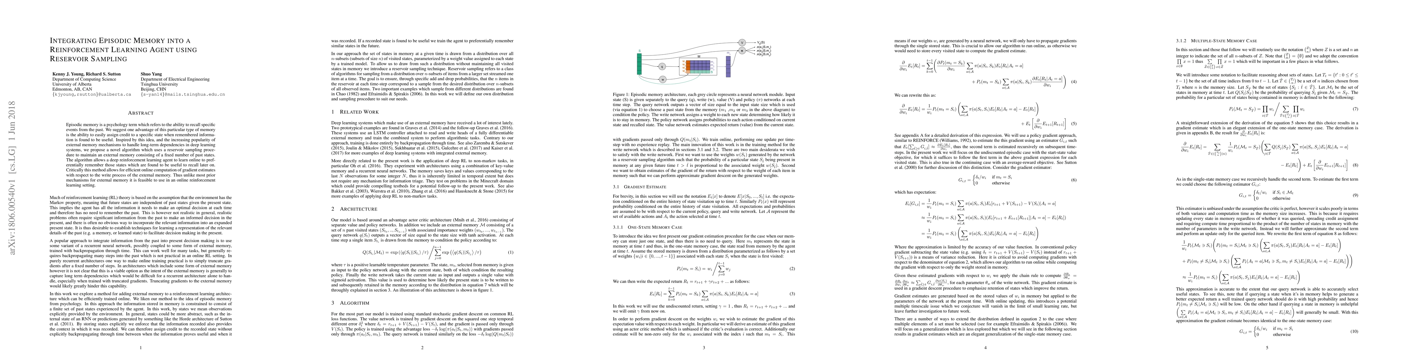 This paper proposes a reinforcement learning algorithm that integrates episodic memory using reservoir sampling to maintain a fixed number of past states. The method enables the agent to learn to remember useful states for future recall, allowing for efficient online computation of gradient estimates, making it feasible for online reinforcement learning.
