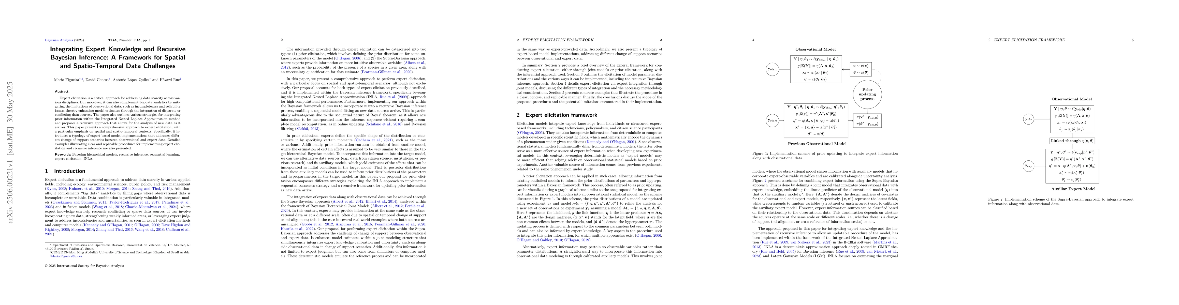 Expert elicitation is a critical approach for addressing data scarcity across various disciplines. But moreover, it can also complement big data analytics by mitigating the limitations of observational data, such as incompleteness and reliability issues, thereby enhancing model estimates through the integration of disparate or conflicting data sources. The paper also outlines various strategies for integrating prior information within the Integrated Nested Laplace Approximation method and proposes a recursive approach that allows for the analysis of new data as it arrives. This paper presents a comprehensive approach to expert elicitation, with a particular emphasis on spatial and spatio-temporal contexts. Specifically, it introduces a typology of expert-based model implementations that addresses different change of support scenarios between observational and expert data. Detailed examples illustrating clear and replicable procedures for implementing expert elicitation and recursive inference are also presented.