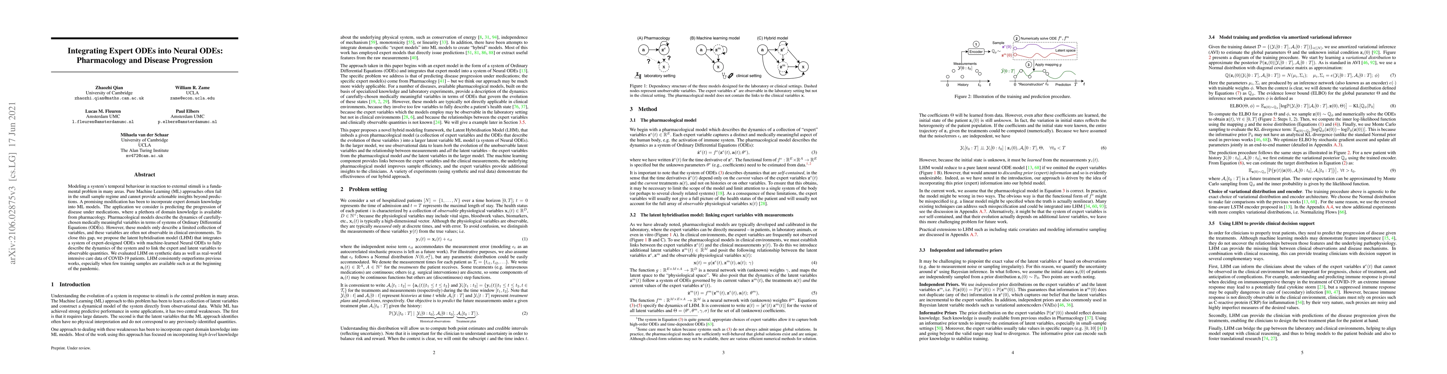 This paper proposes a latent hybridisation model (LHM) that integrates expert-designed ODEs with Neural ODEs to predict disease progression under medication, leveraging both domain knowledge and machine learning. LHM outperforms previous methods, especially in scenarios with limited data, as demonstrated on synthetic and real COVID-19 patient data.