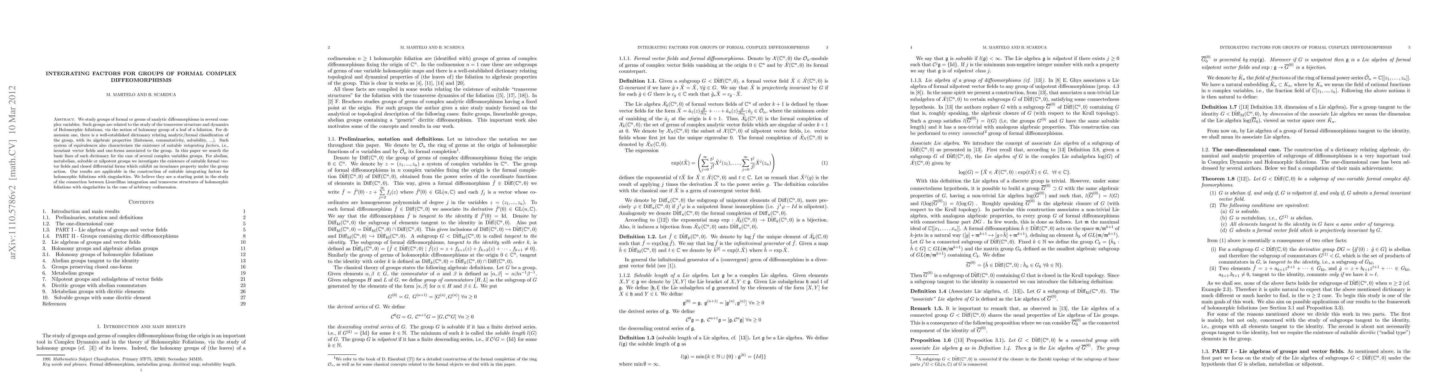 This paper explores the existence of integrating factors for groups of formal complex diffeomorphisms in several complex variables, extending known results for one dimension. It investigates invariant vector fields and closed differential forms for abelian, metabelian, solvable, and nilpotent groups, aiming to construct integrating factors for holomorphic foliations with singularities.