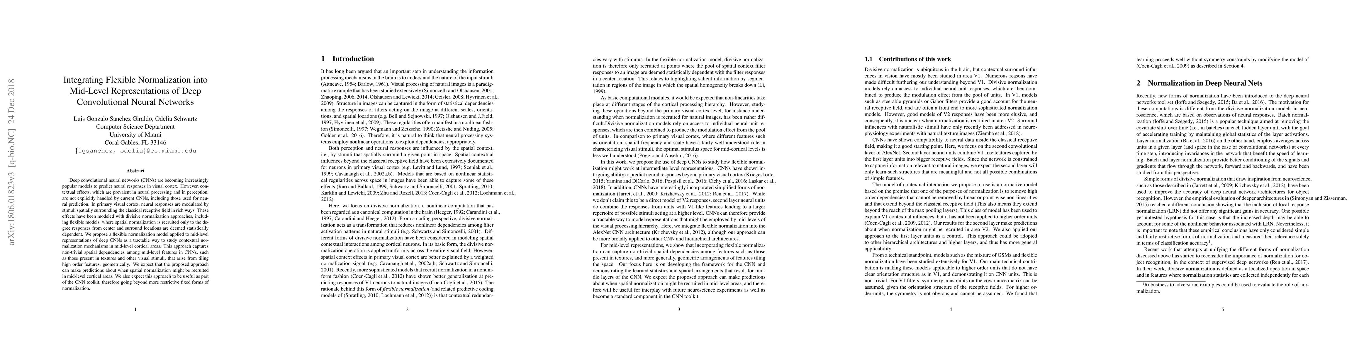 This paper proposes integrating flexible normalization into mid-level representations of deep convolutional neural networks to better model contextual effects in neural processing, akin to how spatial normalization modulates responses in the primary visual cortex. The approach aims to capture non-trivial spatial dependencies among mid-level features and enhance the CNN toolkit beyond fixed normalization methods.