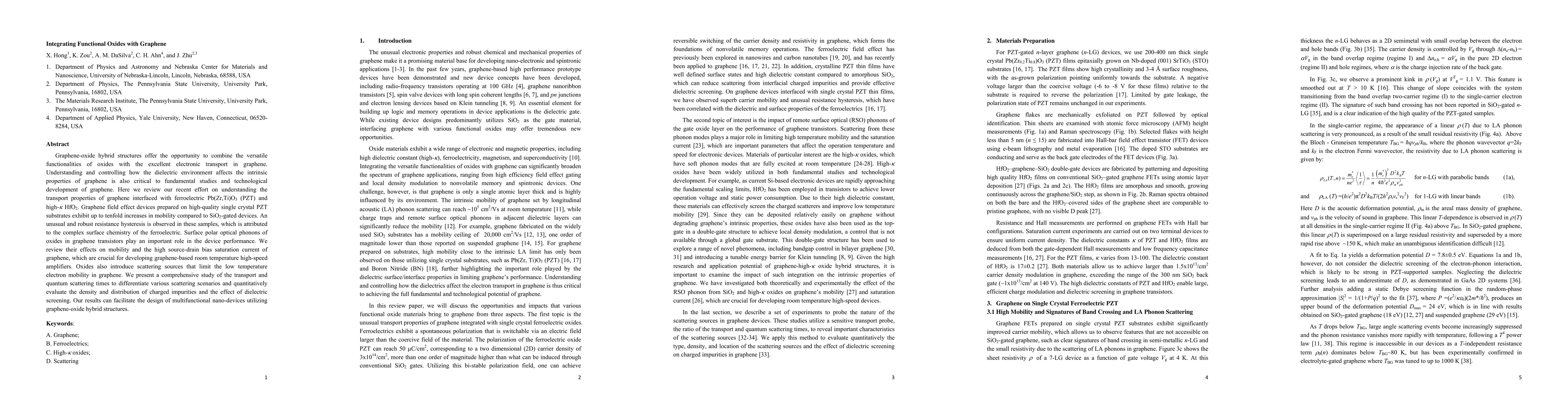 This paper reviews the integration of graphene with functional oxides like ferroelectric Pb(Zr,Ti)O_3 (PZT) and high-k HfO_2, highlighting significant improvements in graphene mobility and unusual resistance hysteresis due to ferroelectric effects. The study also explores the impact of oxide surface polar optical phonons on graphene's transport properties and scattering mechanisms, providing insights for designing advanced graphene-based nano-devices.
