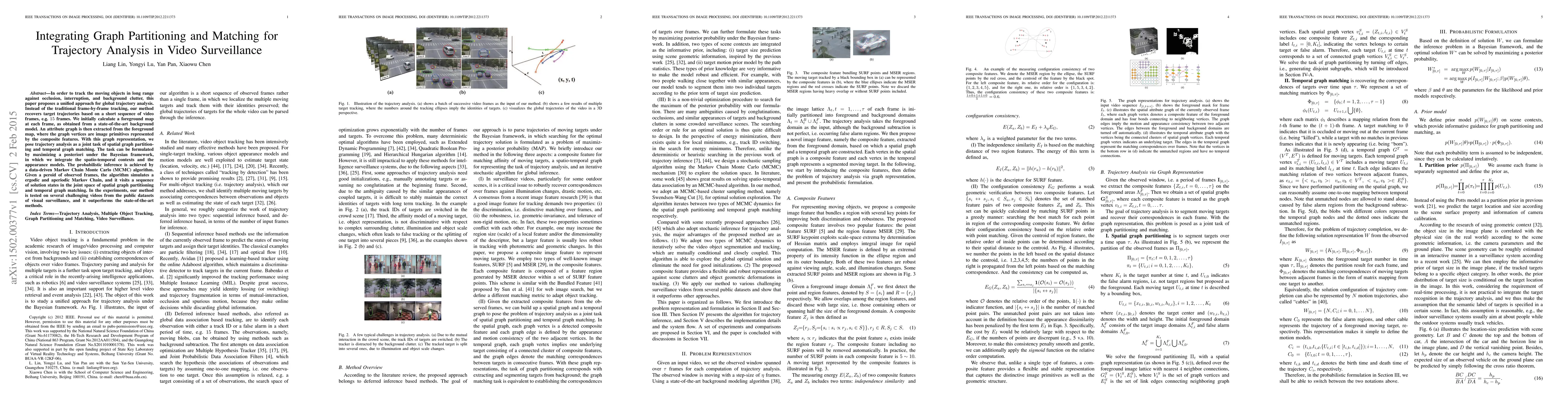 In order to track the moving objects in long range against occlusion, interruption, and background clutter, this paper proposes a unified approach for global trajectory analysis. Instead of the traditional frame-by-frame tracking, our method recovers target trajectories based on a short sequence of video frames, e.g. $15$ frames. We initially calculate a foreground map at each frame, as obtained from a state-of-the-art background model. An attribute graph is then extracted from the foreground map, where the graph vertices are image primitives represented by the composite features. With this graph representation, we pose trajectory analysis as a joint task of spatial graph partitioning and temporal graph matching. The task can be formulated by maximizing a posteriori under the Bayesian framework, in which we integrate the spatio-temporal contexts and the appearance models. The probabilistic inference is achieved by a data-driven Markov Chain Monte Carlo (MCMC) algorithm. Given a peroid of observed frames, the algorithm simulates a ergodic and aperiodic Markov Chain, and it visits a sequence of solution states in the joint space of spatial graph partitioning and temporal graph matching. In the experiments, our method is tested on several challenging videos from the public datasets of visual surveillance, and it outperforms the state-of-the-art methods.