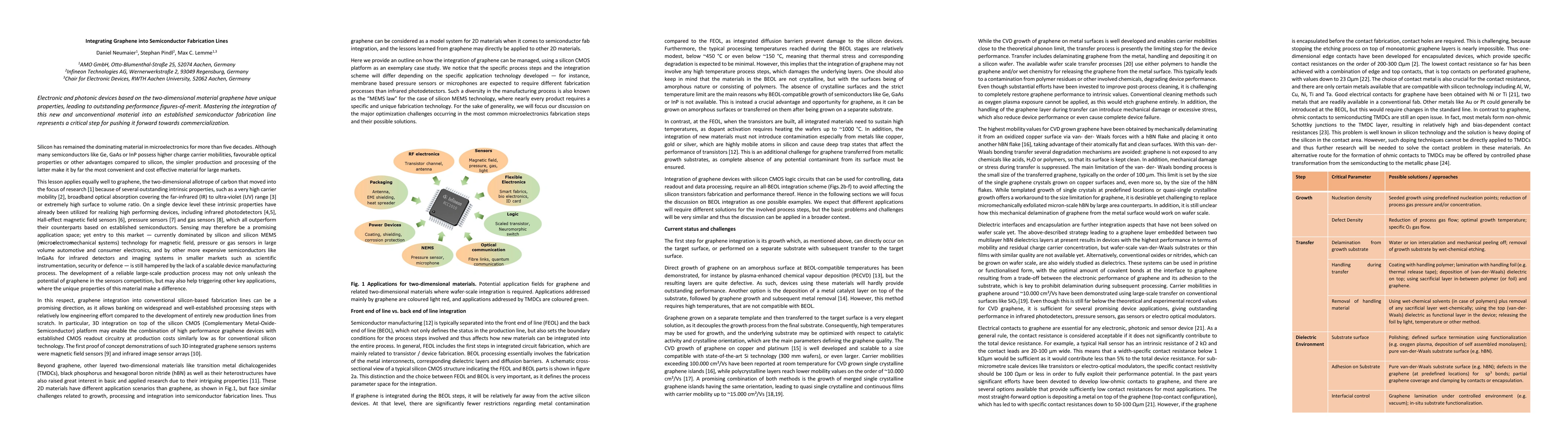 Electronic and photonic devices based on the two-dimensional material graphene have unique properties, leading to outstanding performance figures-of-merit. Mastering the integration of this new and unconventional material into an established semiconductor fabrication line represents a critical step for pushing it forward towards commercialization.