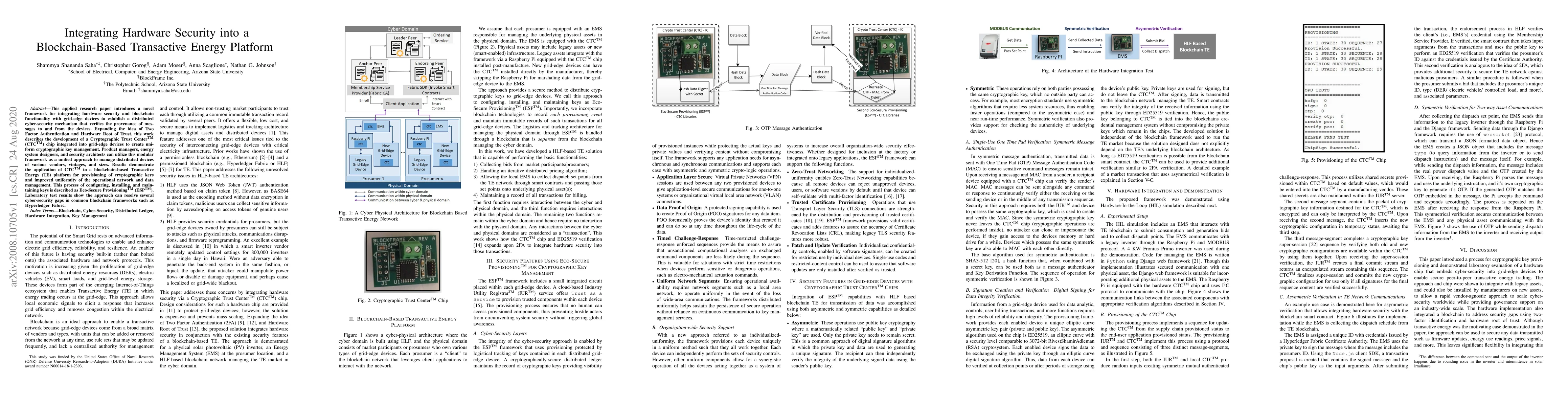 This applied research paper introduces a novel framework for integrating hardware security and blockchain functionality with grid-edge devices to establish a distributed cyber-security mechanism that verifies the provenance of messages to and from the devices. Expanding the idea of Two Factor Authentication and Hardware Root of Trust, this work describes the development of a Cryptographic Trust Center(TM) (CTC(TM)) chip integrated into grid-edge devices to create uniform cryptographic key management. Product managers, energy system designers, and security architects can utilize this modular framework as a unified approach to manage distributed devices of various vendors, vintages, and sizes. Results demonstrate the application of CTC(TM) to a blockchain-based Transactive Energy (TE) platform for provisioning of cryptographic keys and improved uniformity of the operational network and data management. This process of configuring, installing, and maintaining keys is described as Eco-Secure Provisioning(TM) (ESP(TM)). Laboratory test results show the approach can resolve several cyber-security gaps in common blockchain frameworks such as Hyperledger Fabric.