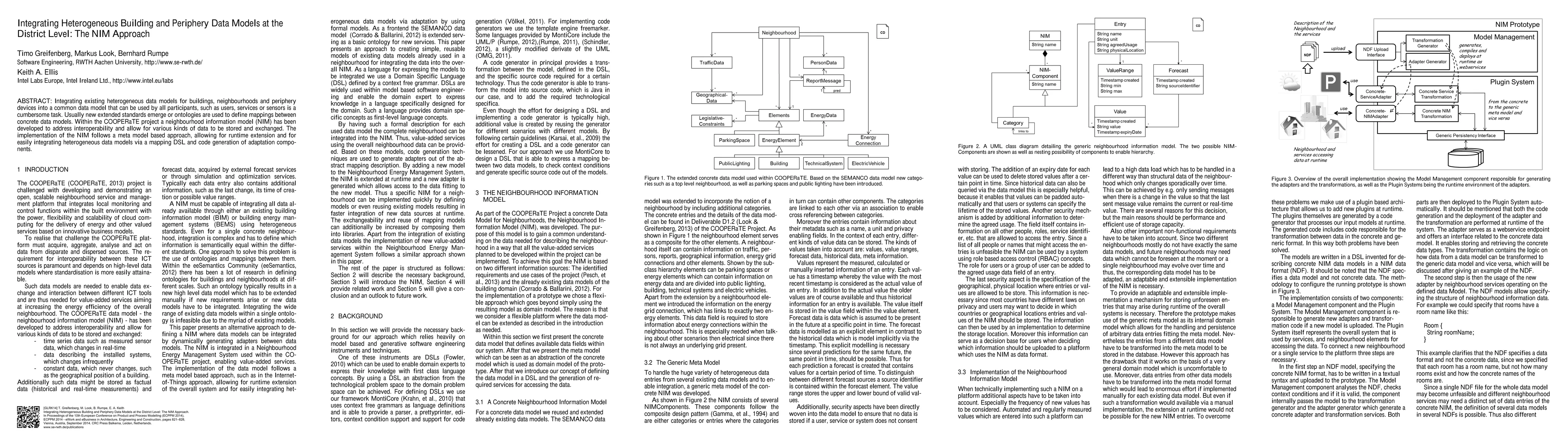 Integrating existing heterogeneous data models for buildings, neighbourhoods and periphery devices into a common data model that can be used by all participants, such as users, services or sensors is a cumbersome task. Usually new extended standards emerge or ontologies are used to define mappings between concrete data models. Within the COOPERaTE project a neighbourhood information model (NIM) has been developed to address interoperability and allow for various kinds of data to be stored and exchanged. The implementation of the NIM follows a meta model based approach, allowing for runtime extension and for easily integrating heterogeneous data models via a mapping DSL and code generation of adaptation components.