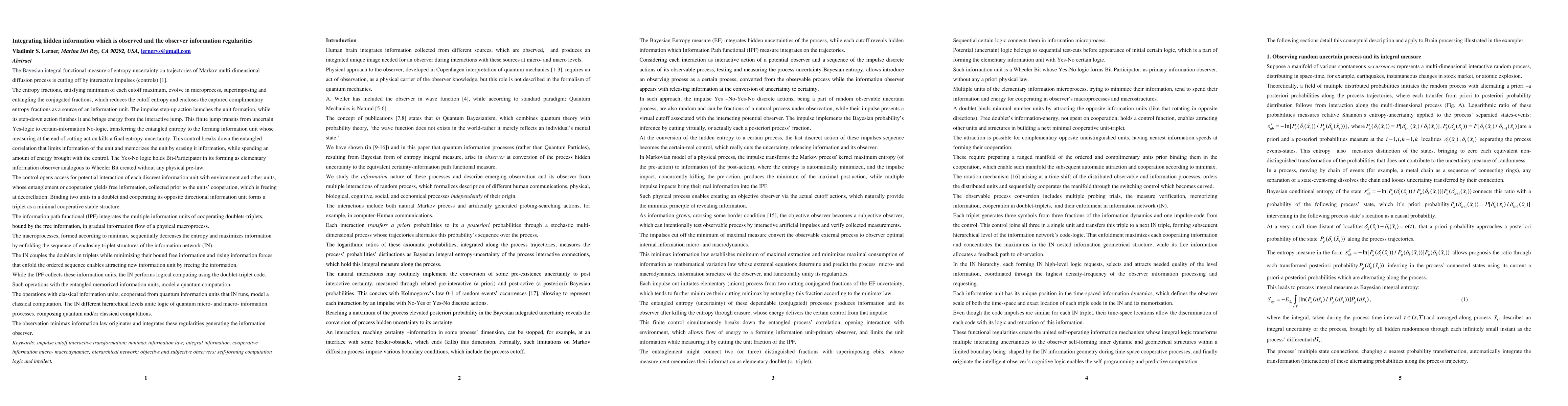 This paper explores the integration of hidden information observed and observer information regularities through the Bayesian entropy-uncertainty measure in Markov diffusion processes. It introduces a mechanism where interactive impulses form elementary information units, transitioning from uncertain to certain information, and utilizes the Yes-No logic to create a Bit Participator. The Information Path Functional (IPF) integrates these units in a network that decreases entropy and maximizes information, enabling quantum and classical computation.