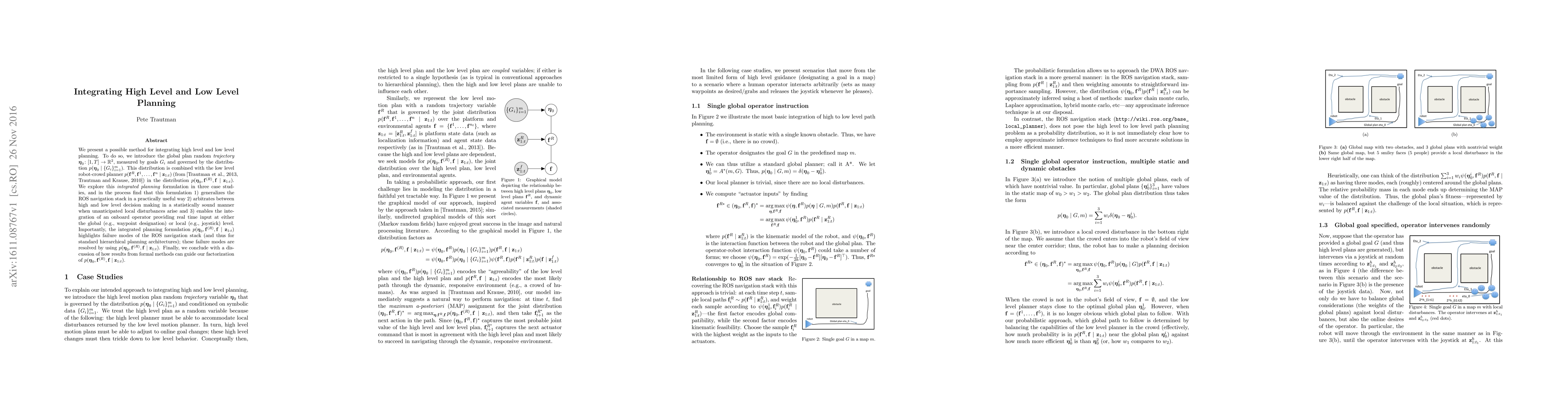 We present a possible method for integrating high level and low level planning. To do so, we introduce the global plan random \emph{trajectory} $\boldsymbol{\eta}_0 \colon [1,T] \to \mathbb R^2$, measured by goals $G_i$ and governed by the distribution $p(\boldsymbol{\eta}_0 \mid \{ G_i\}_{i=1}^m)$. This distribution is combined with the low level robot-crowd planner $p(\mathbf{f}^{R},\mathbf{f}^{1},\ldots,\mathbf{f}^{n}\mid\mathbf{z}_{1:t})$ (from~\cite{trautmanicra2013, trautmaniros}) in the distribution $p(\boldsymbol{\eta}_0,\mathbf{f}^{(R)},\mathbf{f}\mid\mathbf{z}_{1:t})$. We explore this \emph{integrated planning} formulation in three case studies, and in the process find that this formulation 1) generalizes the ROS navigation stack in a practically useful way 2) arbitrates between high and low level decision making in a statistically sound manner when unanticipated local disturbances arise and 3) enables the integration of an onboard operator providing real time input at either the global (e.g., waypoint designation) or local (e.g., joystick) level. Importantly, the integrated planning formulation $p(\boldsymbol{\eta}_0,\mathbf{f}^{(R)},\mathbf{f}\mid\mathbf{z}_{1:t})$ highlights failure modes of the ROS navigation stack (and thus for standard hierarchical planning architectures); these failure modes are resolved by using $p(\boldsymbol{\eta}_0,\mathbf{f}^{(R)},\mathbf{f}\mid\mathbf{z}_{1:t})$. Finally, we conclude with a discussion of how results from formal methods can guide our factorization of $p(\boldsymbol{\eta}_0,\mathbf{f}^{(R)},\mathbf{f}\mid\mathbf{z}_{1:t})$.