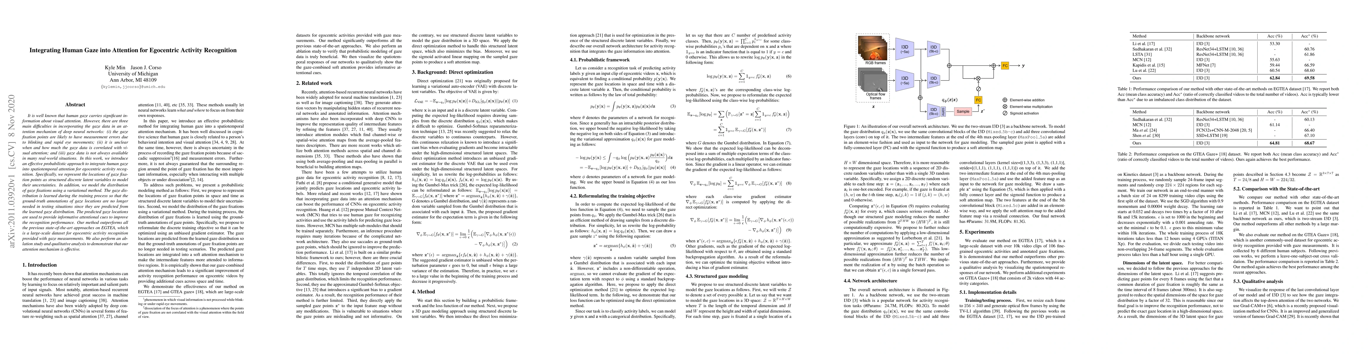 This paper presents a probabilistic method to integrate human gaze data into spatiotemporal attention for enhancing egocentric activity recognition. It addresses the challenges of gaze measurement errors, correlation uncertainty, and data availability by modeling gaze fixation points and using a variational method to learn gaze distribution during training, eliminating the need for ground-truth gaze annotations in testing. The approach improves recognition performance and outperforms previous methods on the EGTEA dataset.