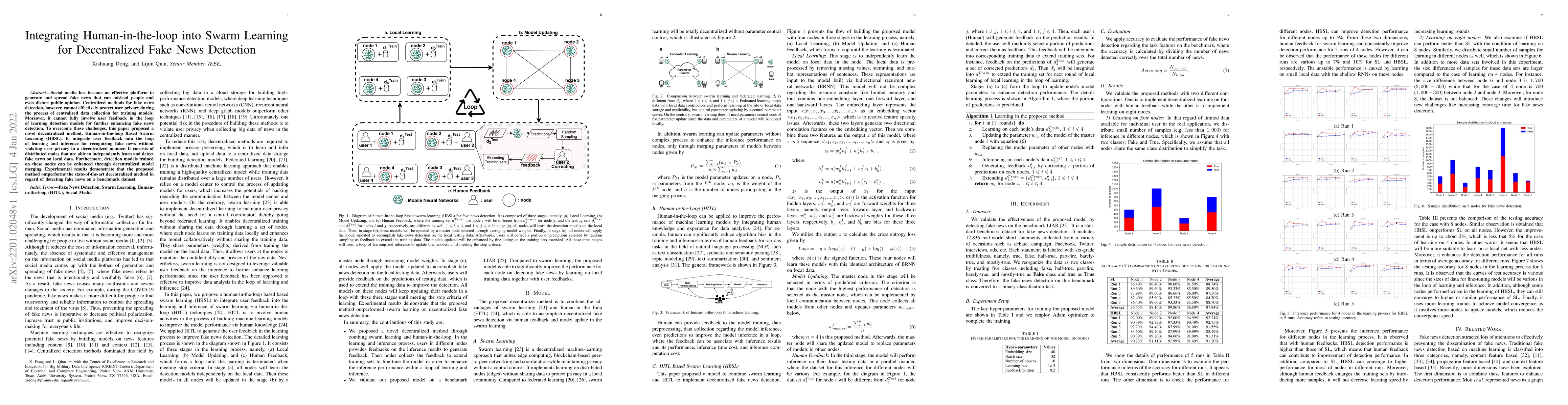 Social media has become an effective platform to generate and spread fake news that can mislead people and even distort public opinion. Centralized methods for fake news detection, however, cannot effectively protect user privacy during the process of centralized data collection for training models. Moreover, it cannot fully involve user feedback in the loop of learning detection models for further enhancing fake news detection. To overcome these challenges, this paper proposed a novel decentralized method, Human-in-the-loop Based Swarm Learning (HBSL), to integrate user feedback into the loop of learning and inference for recognizing fake news without violating user privacy in a decentralized manner. It consists of distributed nodes that are able to independently learn and detect fake news on local data. Furthermore, detection models trained on these nodes can be enhanced through decentralized model merging. Experimental results demonstrate that the proposed method outperforms the state-of-the-art decentralized method in regard of detecting fake news on a benchmark dataset.
