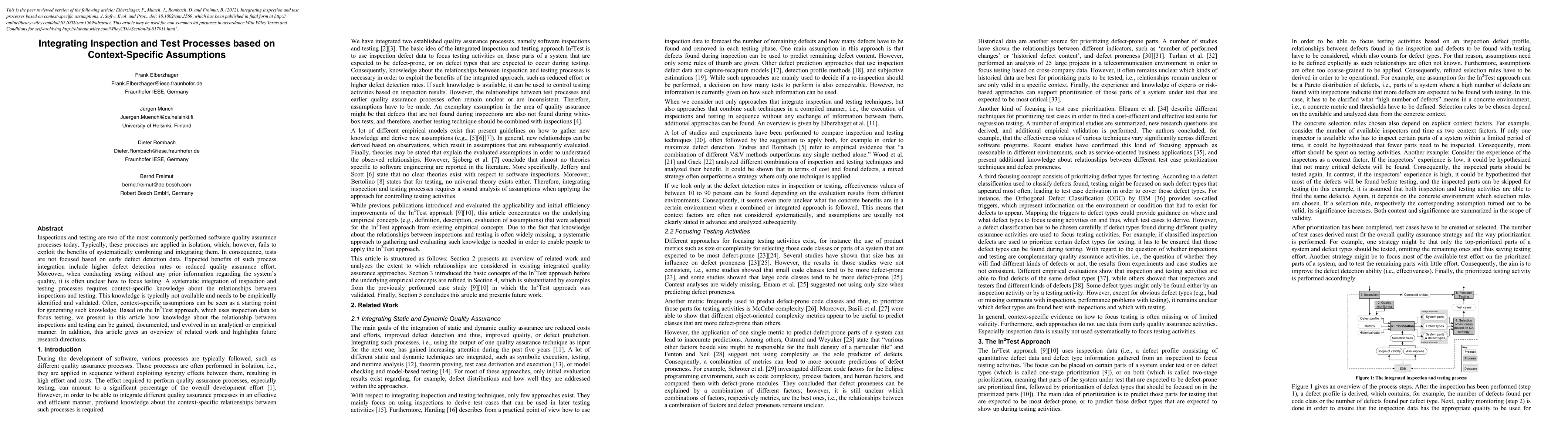 Inspections and testing are two of the most commonly performed software quality assurance processes today. Typically, these processes are applied in isolation, which, however, fails to exploit the benefits of systematically combining and integrating them. In consequence, tests are not focused based on early defect detection data. Expected benefits of such process integration include higher defect detection rates or reduced quality assurance effort. Moreover, when conducting testing without any prior information regarding the system's quality, it is often unclear how to focus testing. A systematic integration of inspection and testing processes requires context-specific knowledge about the relationships between inspections and testing. This knowledge is typically not available and needs to be empirically identified and validated. Often, context-specific assumptions can be seen as a starting point for generating such knowledge. Based on the In2Test approach, which uses inspection data to focus testing, we present in this article how knowledge about the relationship between inspections and testing can be gained, documented, and evolved in an analytical or empirical manner. In addition, this article gives an overview of related work and highlights future research directions.