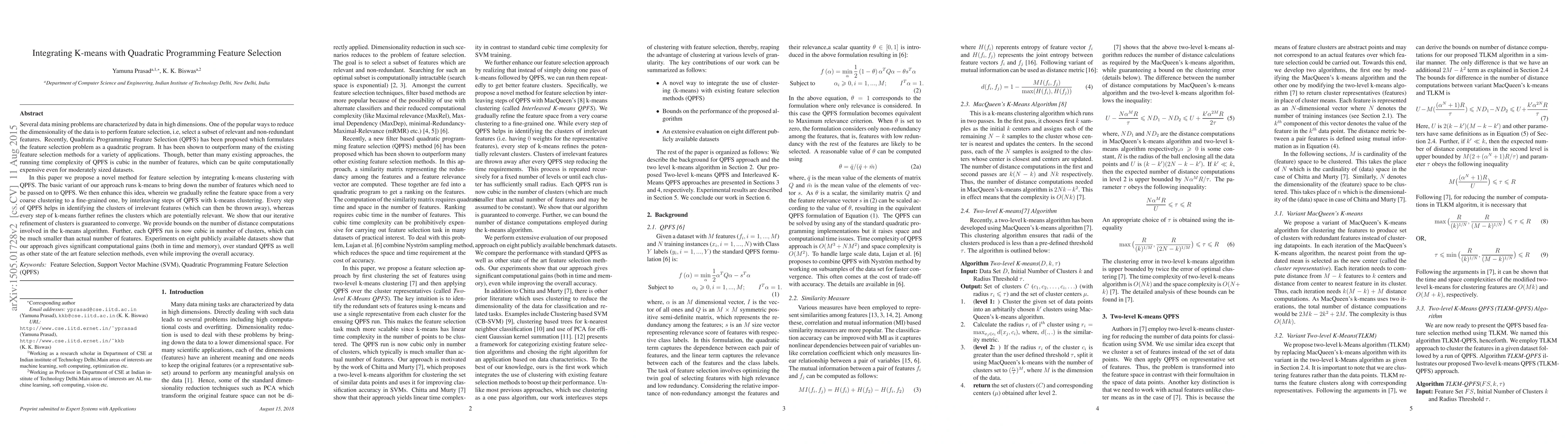This paper proposes an innovative method to integrate k-means clustering with Quadratic Programming Feature Selection (QPFS) to efficiently reduce the dimensionality of high-dimensional data. The approach iteratively refines feature clusters, interleaving k-means with QPFS, which significantly reduces computational complexity and improves accuracy.