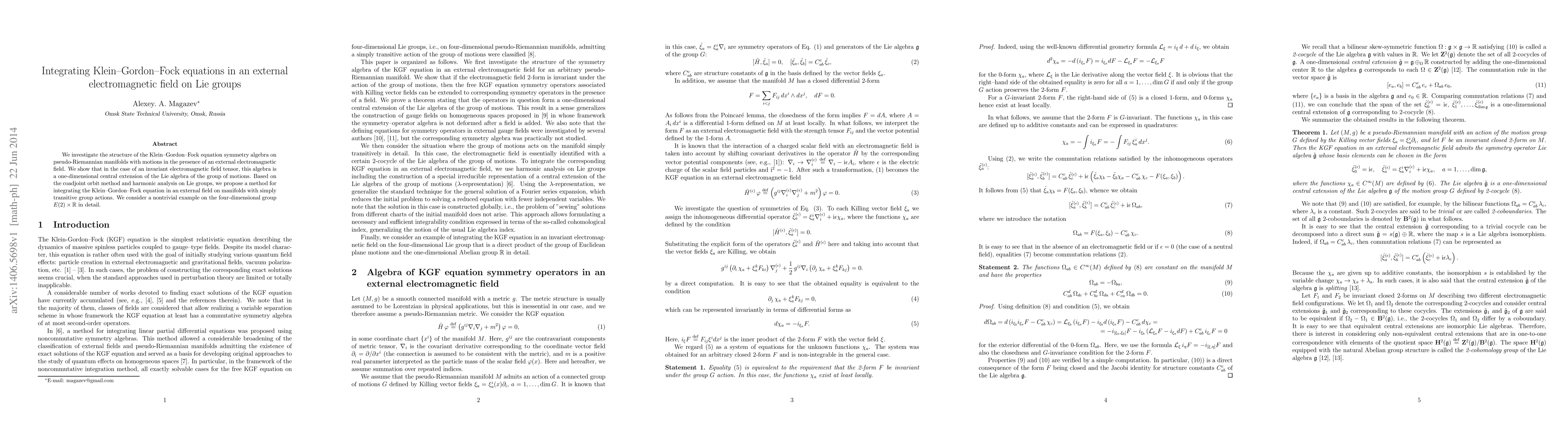 This paper explores the symmetry algebra of the Klein-Gordon-Fock equation on pseudo-Riemannian manifolds under an external electromagnetic field, demonstrating it is a one-dimensional central extension of the Lie algebra of the group of motions. It proposes a method for integrating the equation using the coadjoint orbit method and harmonic analysis on Lie groups, exemplified on the four-dimensional group $E(2) \times \mathbb{R}$.