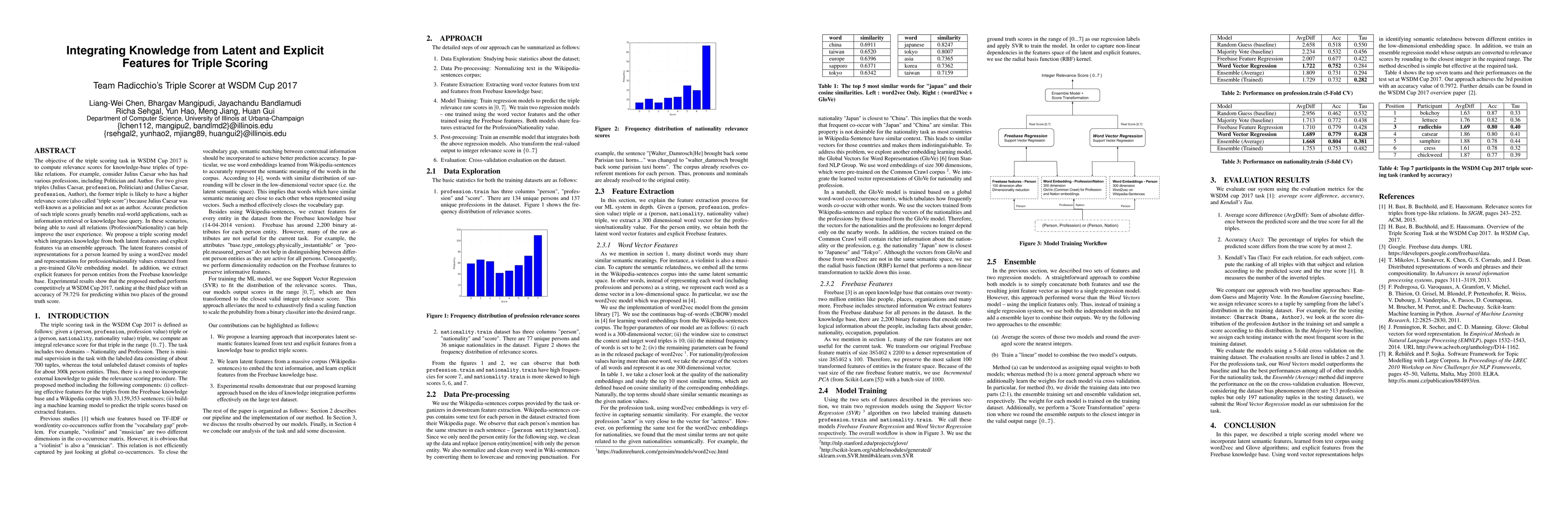 The objective of the triple scoring task in WSDM Cup 2017 is to compute relevance scores for knowledge-base triples of type-like relations. For example, consider Julius Caesar who has had various professions, including Politician and Author. For two given triples (Julius Caesar, profession, Politician) and (Julius Caesar, profession, Author), the former triple is likely to have a higher relevance score (also called "triple score") because Julius Caesar was well-known as a politician and not as an author. Accurate prediction of such triple scores greatly benefits real-world applications, such as information retrieval or knowledge base query. In these scenarios, being able to rank all relations (Profession/Nationality) can help improve the user experience. We propose a triple scoring model which integrates knowledge from both latent features and explicit features via an ensemble approach. The latent features consist of representations for a person learned by using a word2vec model and representations for profession/nationality values extracted from a pre-trained GloVe embedding model. In addition, we extract explicit features for person entities from the Freebase knowledge base. Experimental results show that the proposed method performs competitively at WSDM Cup 2017, ranking at the third place with an accuracy of 79.72% for predicting within two places of the ground truth score.