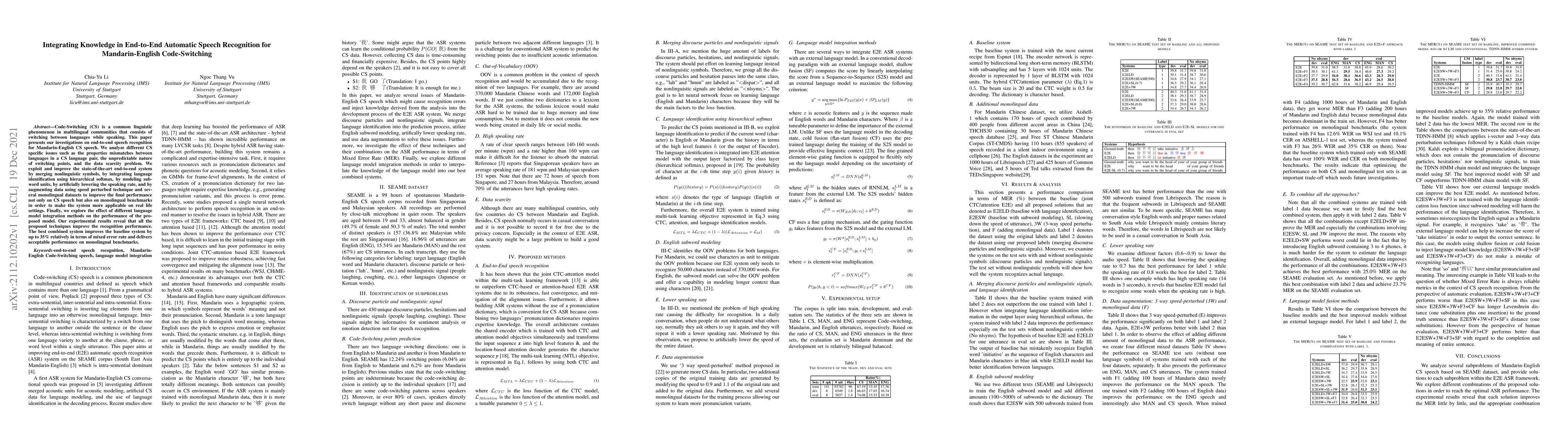 Code-Switching (CS) is a common linguistic phenomenon in multilingual communities that consists of switching between languages while speaking. This paper presents our investigations on end-to-end speech recognition for Mandarin-English CS speech. We analyse different CS specific issues such as the properties mismatches between languages in a CS language pair, the unpredictable nature of switching points, and the data scarcity problem. We exploit and improve the state-of-the-art end-to-end system by merging nonlinguistic symbols, by integrating language identification using hierarchical softmax, by modeling sub-word units, by artificially lowering the speaking rate, and by augmenting data using speed perturbed technique and several monolingual datasets to improve the final performance not only on CS speech but also on monolingual benchmarks in order to make the system more applicable on real life settings. Finally, we explore the effect of different language model integration methods on the performance of the proposed model. Our experimental results reveal that all the proposed techniques improve the recognition performance. The best combined system improves the baseline system by up to 35% relatively in terms of mixed error rate and delivers acceptable performance on monolingual benchmarks.