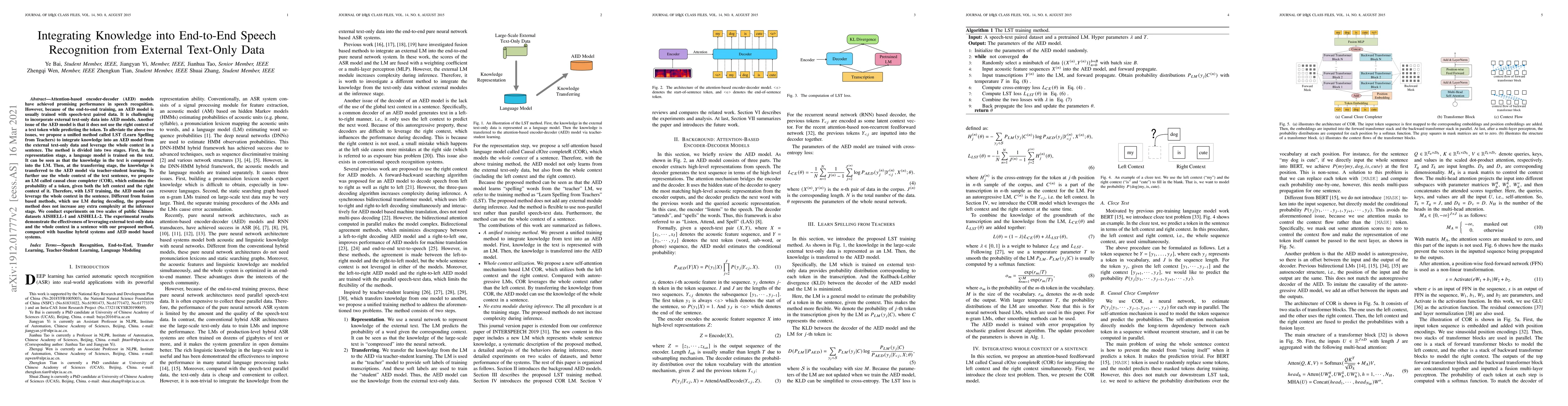 This paper proposes a method called LST to integrate external text-only data and leverage whole sentence context into attention-based encoder-decoder models for speech recognition. The LST method uses a language model trained on text to transfer knowledge to the speech recognition model via teacher-student learning, without increasing inference complexity.