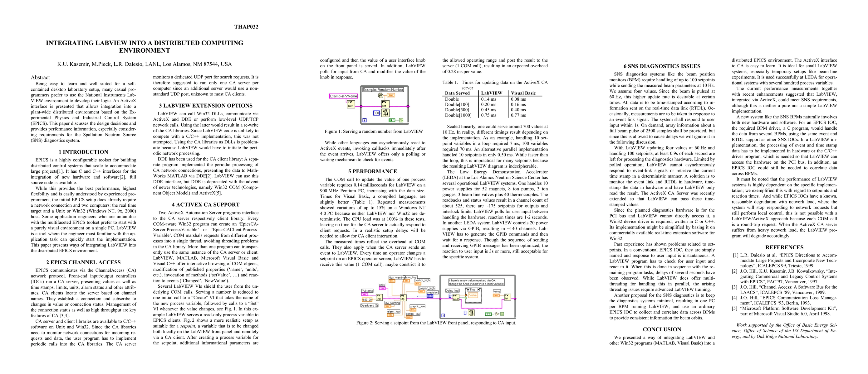 This paper presents an ActiveX interface for integrating the easy-to-learn LabVIEW environment into a distributed computing system based on EPICS, focusing on design decisions and performance metrics tailored for the Spallation Neutron Source diagnostics system.