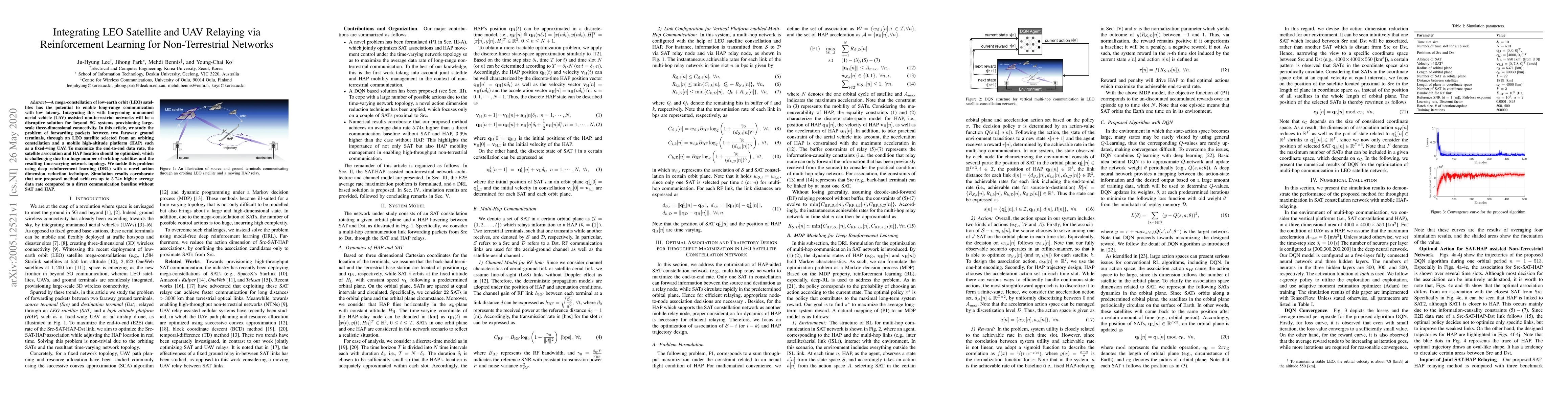 This research paper proposes a novel method to optimize satellite association and UAV location for long-range communication using reinforcement learning, achieving up to 5.74x higher average data rate than direct communication.