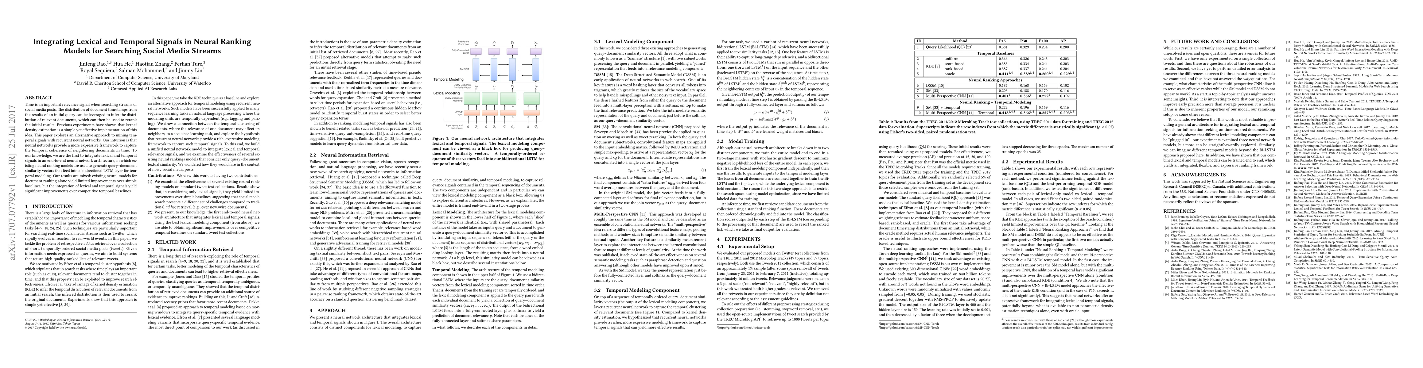 This paper proposes a neural ranking model that integrates lexical and temporal signals to enhance the search of social media streams. It uses bidirectional LSTMs to capture temporal coherence and finds that combining these signals significantly improves performance over traditional temporal baselines.