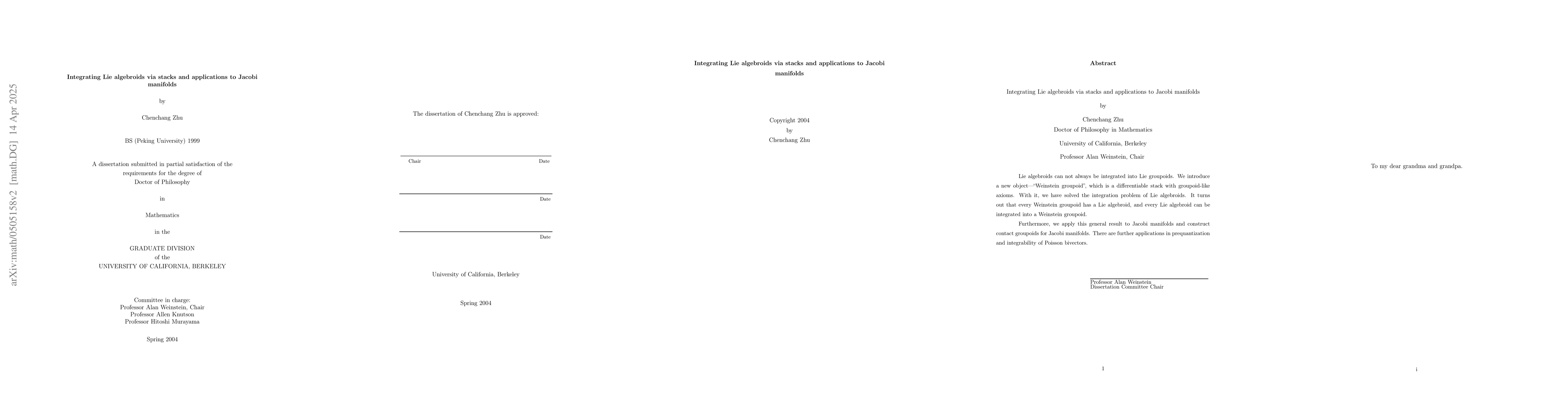 This paper introduces the concept of a Weinstein groupoid, a differentiable stack with groupoid-like axioms, to solve the integration problem of Lie algebroids, and applies it to Jacobi manifolds to construct contact groupoids.