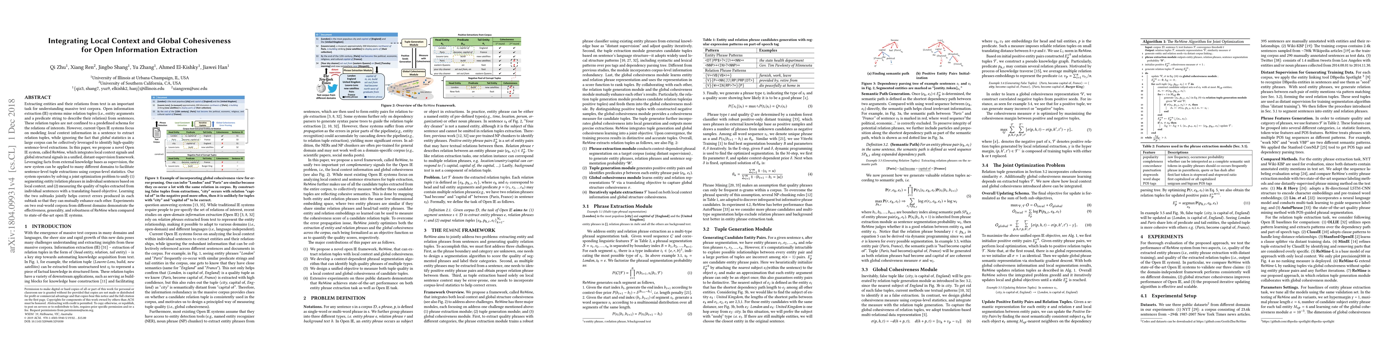 Extracting entities and their relations from text is an important task for understanding massive text corpora. Open information extraction (IE) systems mine relation tuples (i.e., entity arguments and a predicate string to describe their relation) from sentences. These relation tuples are not confined to a predefined schema for the relations of interests. However, current Open IE systems focus on modeling local context information in a sentence to extract relation tuples, while ignoring the fact that global statistics in a large corpus can be collectively leveraged to identify high-quality sentence-level extractions. In this paper, we propose a novel Open IE system, called ReMine, which integrates local context signals and global structural signals in a unified, distant-supervision framework. Leveraging facts from external knowledge bases as supervision, the new system can be applied to many different domains to facilitate sentence-level tuple extractions using corpus-level statistics. Our system operates by solving a joint optimization problem to unify (1) segmenting entity/relation phrases in individual sentences based on local context; and (2) measuring the quality of tuples extracted from individual sentences with a translating-based objective. Learning the two subtasks jointly helps correct errors produced in each subtask so that they can mutually enhance each other. Experiments on two real-world corpora from different domains demonstrate the effectiveness, generality, and robustness of ReMine when compared to state-of-the-art open IE systems.