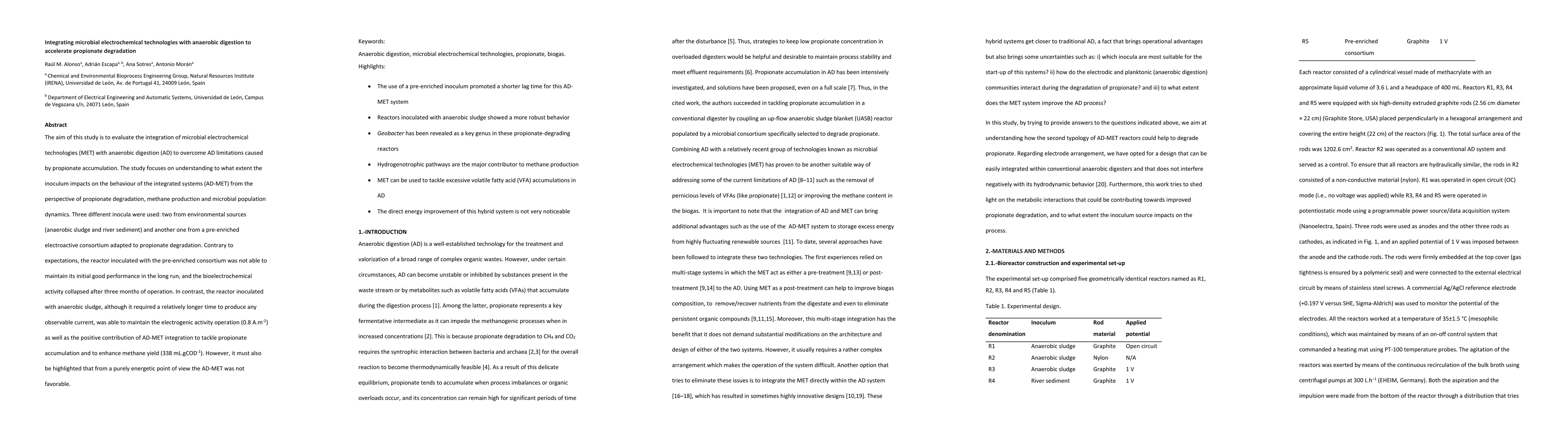 This study evaluates integrating microbial electrochemical technologies with anaerobic digestion to mitigate propionate accumulation, finding that while anaerobic sludge inoculum maintained electrogenic activity and improved methane yield, the pre-enriched electroactive consortium did not sustain performance, and the overall energy efficiency of the integrated system was unfavorable.