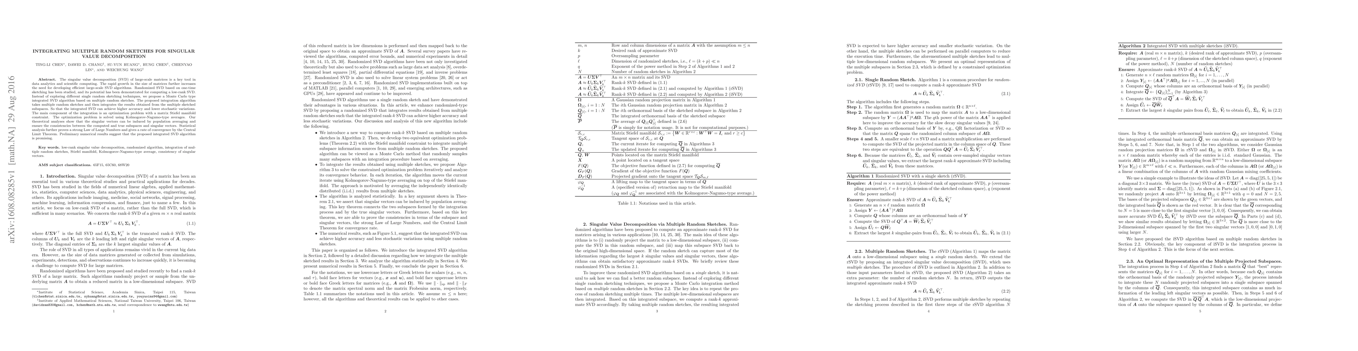 This paper proposes an integrated SVD algorithm that combines multiple random sketches to achieve higher accuracy in large-scale matrix decomposition. The method uses an optimization problem with matrix Stiefel manifold constraints, solved via Kolmogorov-Nagumo-type averages, and demonstrates strong consistency and convergence rates through theoretical analysis and preliminary numerical results.