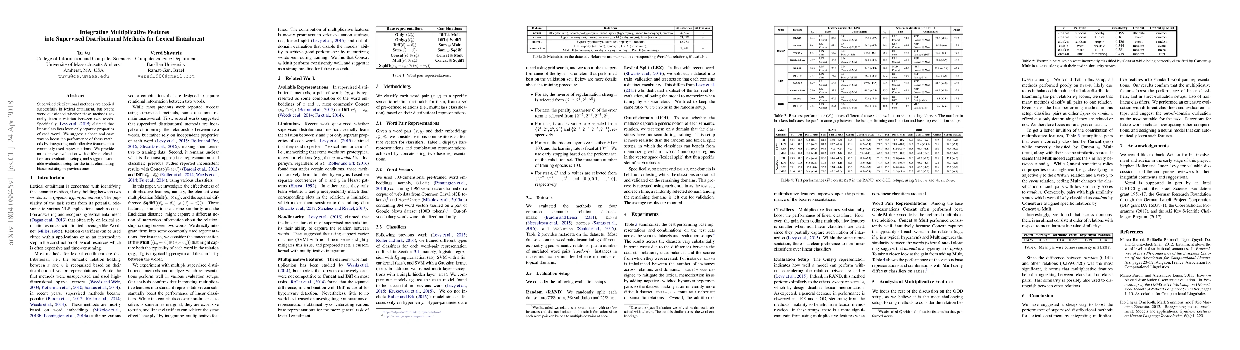 This paper proposes integrating multiplicative features into supervised distributional methods to enhance lexical entailment performance, addressing concerns that these methods only learn separate properties of words. The authors provide a thorough evaluation and suggest a more suitable evaluation setup to eliminate previous biases.