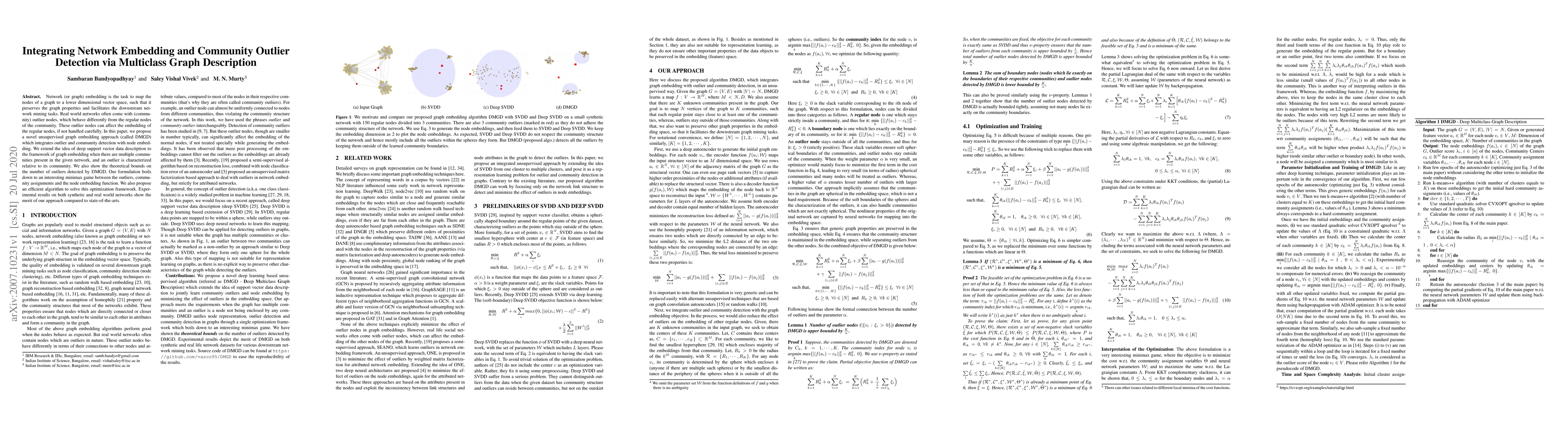 This paper proposes DMGD, an unsupervised graph embedding method that integrates community and outlier detection to improve node embeddings. The approach extends deep support vector data description to handle multiple communities and characterizes outliers relative to their communities, demonstrating theoretical bounds and an efficient optimization algorithm. Experimental results show its superiority over state-of-the-art methods.