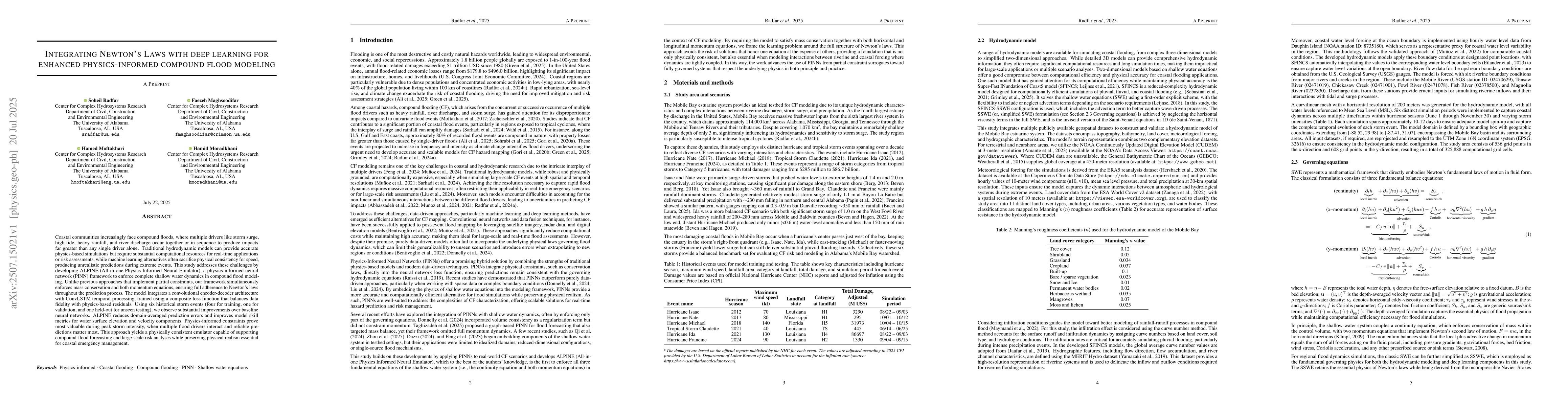 The research develops ALPINE, a physics-informed neural network (PINN) framework that enforces complete shallow water dynamics for compound flood modeling, integrating mass conservation and momentum equations within a unified deep learning architecture.