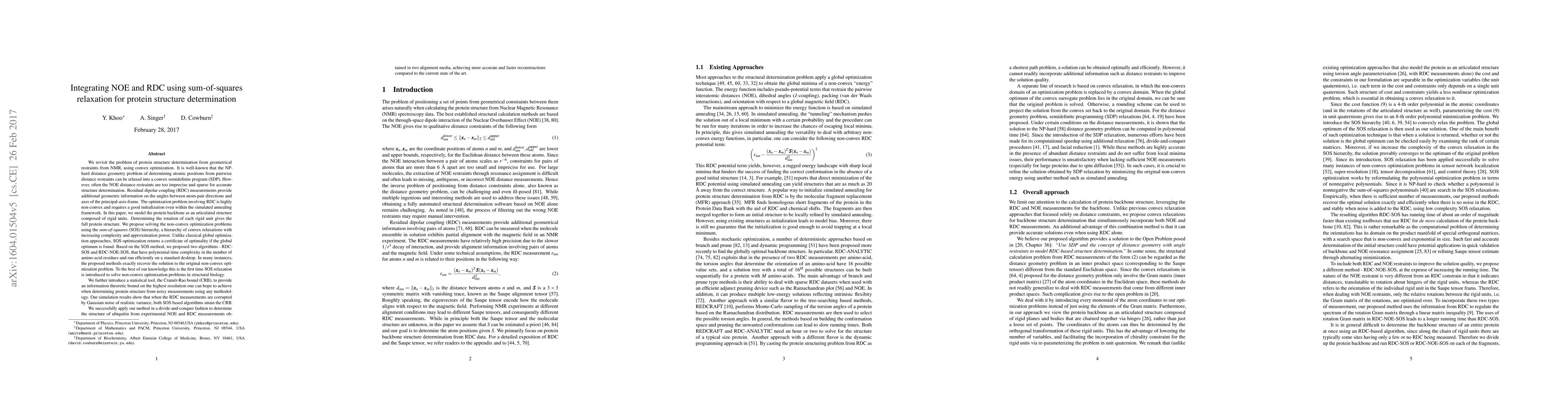 This paper proposes using sum-of-squares relaxation to solve non-convex optimization problems for protein structure determination from NMR data, integrating NOE and RDC measurements. The RDC-SOS and RDC-NOE-SOS algorithms achieve accurate and efficient reconstructions, matching the Cramer-Rao bound under realistic noise conditions, and outperform current methods in determining ubiquitin's structure.