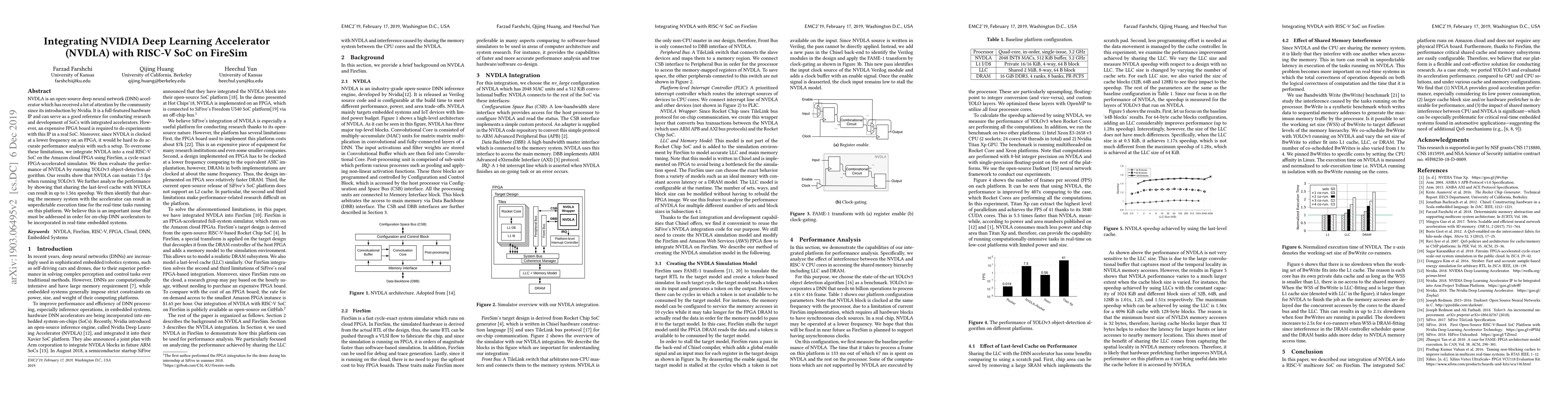 This paper integrates the NVDLA deep learning accelerator into a RISC-V SoC on FireSim, demonstrating its performance using YOLOv3. The study shows NVDLA can sustain 7.5 fps and highlights the benefits of cache sharing for performance, while also noting unpredictable execution times when sharing memory systems, emphasizing the need for addressing this issue for real-time applications.