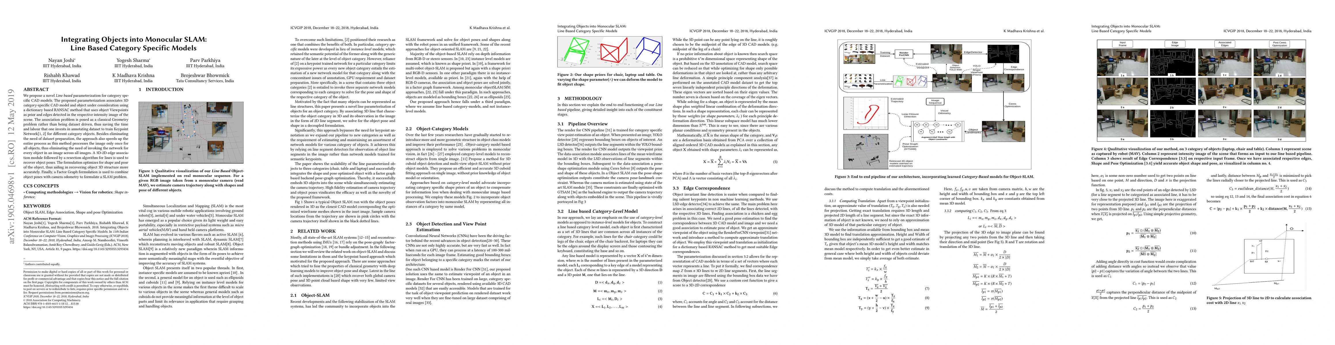 We propose a novel Line based parameterization for category specific CAD models. The proposed parameterization associates 3D category-specific CAD model and object under consideration using a dictionary based RANSAC method that uses object Viewpoints as prior and edges detected in the respective intensity image of the scene. The association problem is posed as a classical Geometry problem rather than being dataset driven, thus saving the time and labour that one invests in annotating dataset to train Keypoint Network for different category objects. Besides eliminating the need of dataset preparation, the approach also speeds up the entire process as this method processes the image only once for all objects, thus eliminating the need of invoking the network for every object in an image across all images. A 3D-2D edge association module followed by a resection algorithm for lines is used to recover object poses. The formulation optimizes for shape and pose of the object, thus aiding in recovering object 3D structure more accurately. Finally, a Factor Graph formulation is used to combine object poses with camera odometry to formulate a SLAM problem.