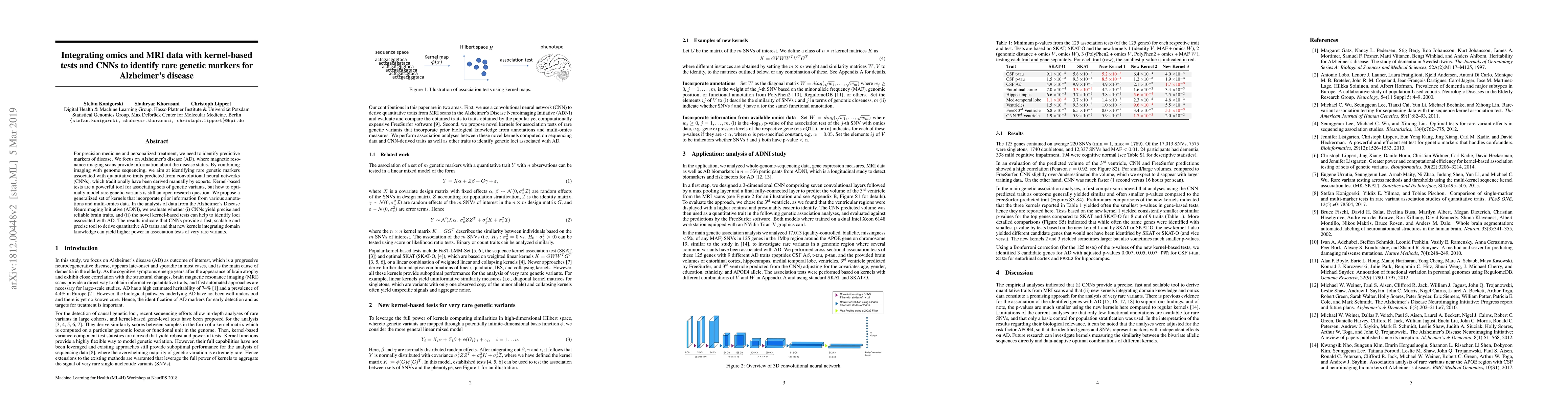 For precision medicine and personalized treatment, we need to identify predictive markers of disease. We focus on Alzheimer's disease (AD), where magnetic resonance imaging scans provide information about the disease status. By combining imaging with genome sequencing, we aim at identifying rare genetic markers associated with quantitative traits predicted from convolutional neural networks (CNNs), which traditionally have been derived manually by experts. Kernel-based tests are a powerful tool for associating sets of genetic variants, but how to optimally model rare genetic variants is still an open research question. We propose a generalized set of kernels that incorporate prior information from various annotations and multi-omics data. In the analysis of data from the Alzheimer's Disease Neuroimaging Initiative (ADNI), we evaluate whether (i) CNNs yield precise and reliable brain traits, and (ii) the novel kernel-based tests can help to identify loci associated with AD. The results indicate that CNNs provide a fast, scalable and precise tool to derive quantitative AD traits and that new kernels integrating domain knowledge can yield higher power in association tests of very rare variants.