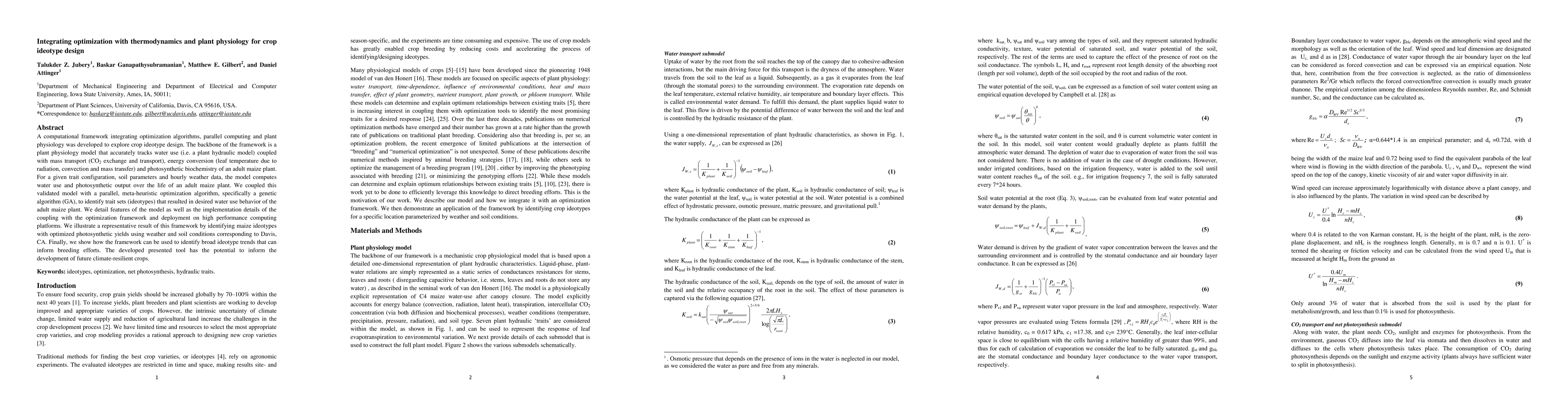 This paper presents a computational framework integrating optimization algorithms with plant physiology to design crop ideotypes, specifically for maize. It combines a detailed plant model with a genetic algorithm to identify optimal trait sets for desired water use and photosynthetic efficiency under specific environmental conditions.