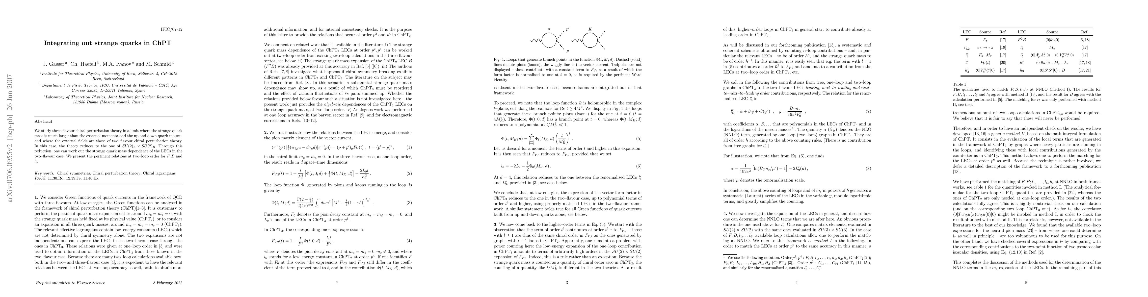 We study three flavour chiral perturbation theory in a limit where the strange quark mass is much larger than the external momenta and the up and down quark masses, and where the external fields are those of two-flavour chiral perturbation theory. In this case, the theory reduces to the one of SU(2)_L x SU(2)_R. Through this reduction, one can work out the strange quark mass dependence of the LECs in the two-flavour case. We present the pertinent relations at two-loop order for F,B and l_i.