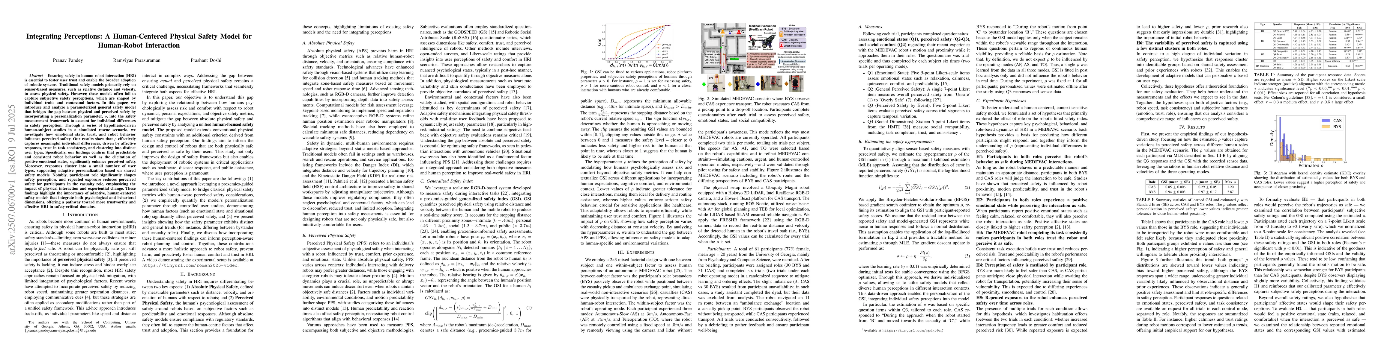 Ensuring safety in human-robot interaction (HRI) is essential to foster user trust and enable the broader adoption of robotic systems. Traditional safety models primarily rely on sensor-based measures, such as relative distance and velocity, to assess physical safety. However, these models often fail to capture subjective safety perceptions, which are shaped by individual traits and contextual factors. In this paper, we introduce and analyze a parameterized general safety model that bridges the gap between physical and perceived safety by incorporating a personalization parameter, $\rho$, into the safety measurement framework to account for individual differences in safety perception. Through a series of hypothesis-driven human-subject studies in a simulated rescue scenario, we investigate how emotional state, trust, and robot behavior influence perceived safety. Our results show that $\rho$ effectively captures meaningful individual differences, driven by affective responses, trust in task consistency, and clustering into distinct user types. Specifically, our findings confirm that predictable and consistent robot behavior as well as the elicitation of positive emotional states, significantly enhance perceived safety. Moreover, responses cluster into a small number of user types, supporting adaptive personalization based on shared safety models. Notably, participant role significantly shapes safety perception, and repeated exposure reduces perceived safety for participants in the casualty role, emphasizing the impact of physical interaction and experiential change. These findings highlight the importance of adaptive, human-centered safety models that integrate both psychological and behavioral dimensions, offering a pathway toward more trustworthy and effective HRI in safety-critical domains.