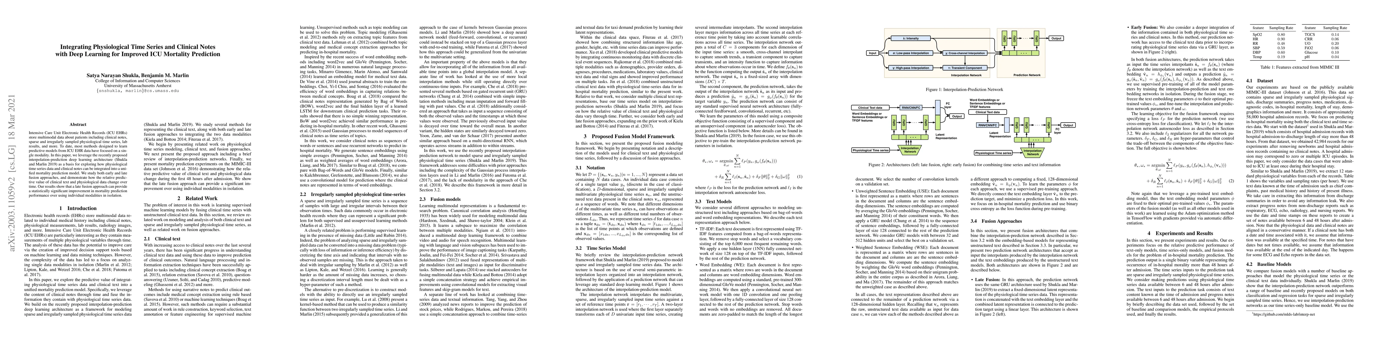 This paper explores integrating physiological time series and clinical notes using deep learning to improve ICU mortality prediction. It demonstrates that late fusion of these data modalities provides a statistically significant improvement over using either modality alone.