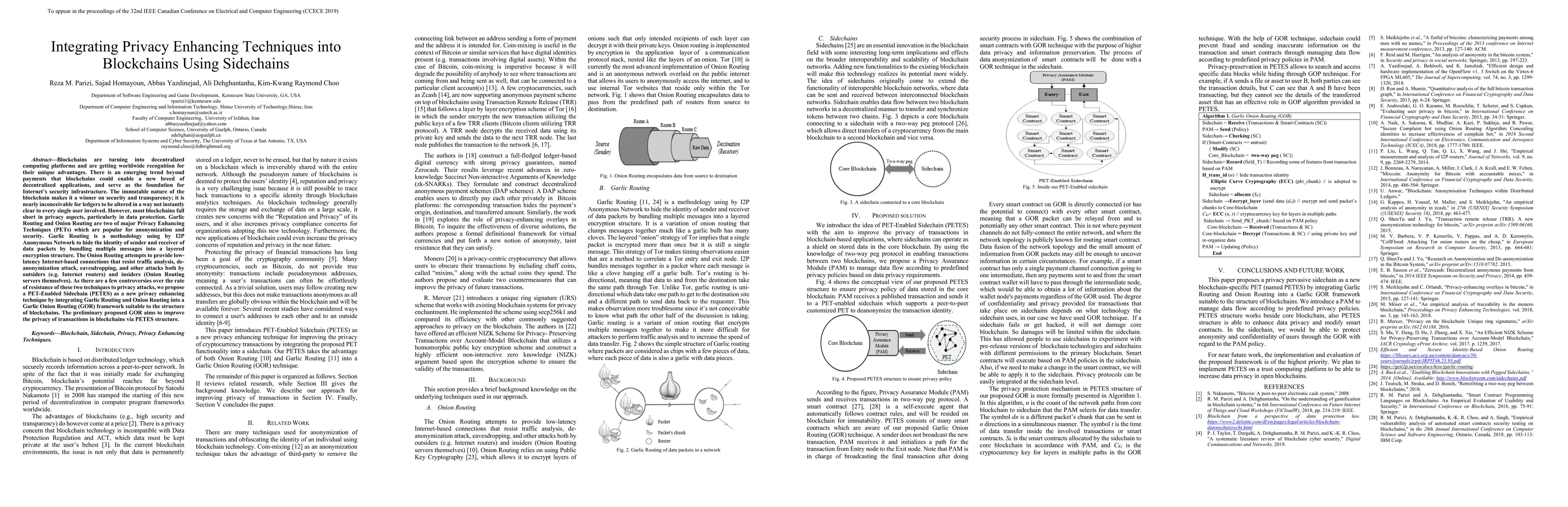 Blockchains are turning into decentralized computing platforms and are getting worldwide recognition for their unique advantages. There is an emerging trend beyond payments that blockchains could enable a new breed of decentralized applications, and serve as the foundation for Internet's security infrastructure. The immutable nature of the blockchain makes it a winner on security and transparency; it is nearly inconceivable for ledgers to be altered in a way not instantly clear to every single user involved. However, most blockchains fall short in privacy aspects, particularly in data protection. Garlic Routing and Onion Routing are two of major Privacy Enhancing Techniques (PETs) which are popular for anonymization and security. Garlic Routing is a methodology using by I2P Anonymous Network to hide the identity of sender and receiver of data packets by bundling multiple messages into a layered encryption structure. The Onion Routing attempts to provide lowlatency Internet-based connections that resist traffic analysis, deanonymization attack, eavesdropping, and other attacks both by outsiders (e.g. Internet routers) and insiders (Onion Routing servers themselves). As there are a few controversies over the rate of resistance of these two techniques to privacy attacks, we propose a PET-Enabled Sidechain (PETES) as a new privacy enhancing technique by integrating Garlic Routing and Onion Routing into a Garlic Onion Routing (GOR) framework suitable to the structure of blockchains. The preliminary proposed GOR aims to improve the privacy of transactions in blockchains via PETES structure.