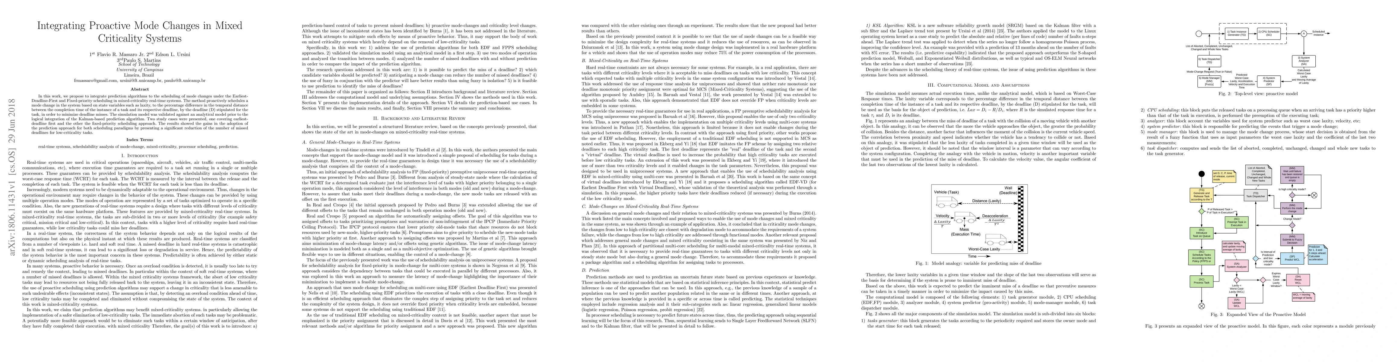 In this work, we propose to integrate prediction algorithms to the scheduling of mode changes under the Earliest-Deadline-First and Fixed-priority scheduling in mixed-criticality real-time systems. The method proactively schedules a mode change in the system based on state variables such as laxity, to the percentage difference in the temporal distance between the completion time of the instance of a task and its respective deadline, by the deadline (D) stipulated for the task, in order to minimize deadline misses. The simulation model was validated against an analytical model prior to the logical integration of the Kalman-based prediction algorithm. Two study cases were presented, one covering earliest-deadline first and the other the fixed-priority scheduling approach. The results showed the gains in the adoption of the prediction approach for both scheduling paradigms by presenting a significant reduction of the number of missed deadlines for low-criticality tasks.