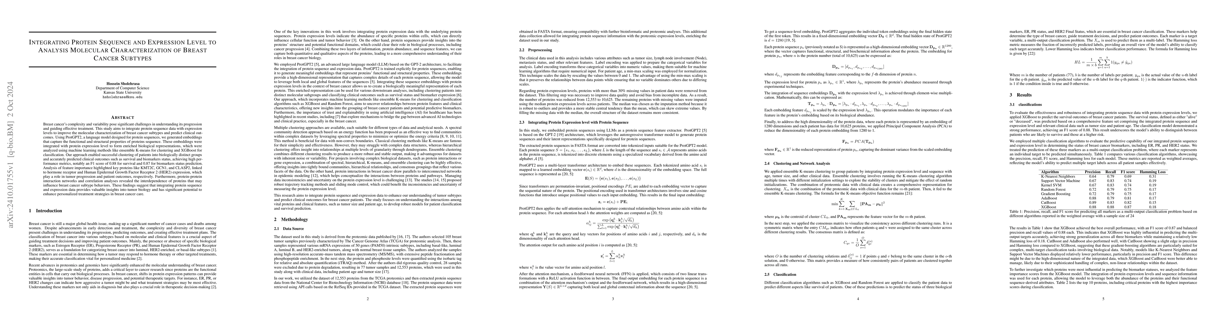 This study integrates protein sequence data with expression levels to enhance molecular characterization of breast cancer subtypes, employing ProtGPT2 for embeddings and machine learning methods to cluster patients and predict clinical outcomes, achieving high accuracy. Key proteins linked to hormone receptor and HER2 expression were identified, underscoring the potential of this integrated approach for personalized breast cancer treatment.