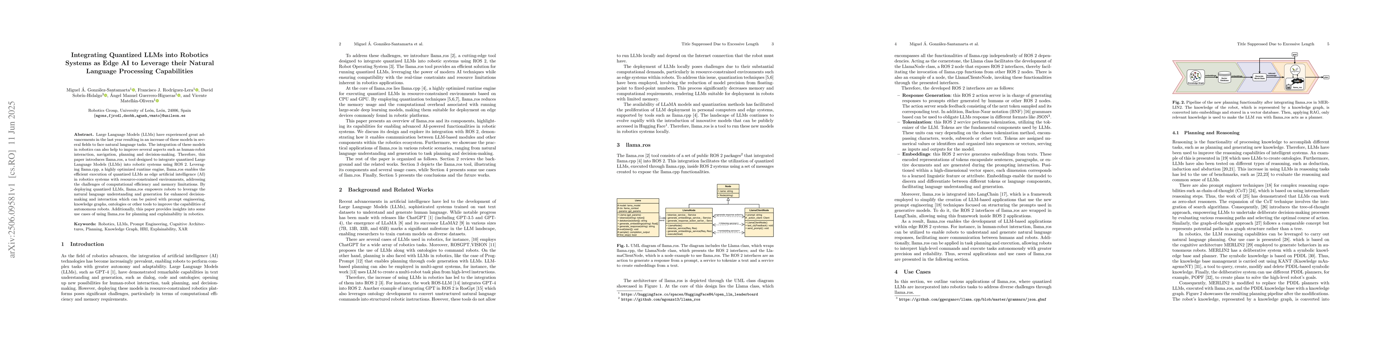 This paper presents llama_ros, a tool for integrating quantized Large Language Models (LLMs) into robotic systems using ROS 2, enabling efficient edge AI for natural language processing. It improves human-robot interaction, navigation, planning, and decision-making, offering insights into use cases for planning and explainability in robotics.