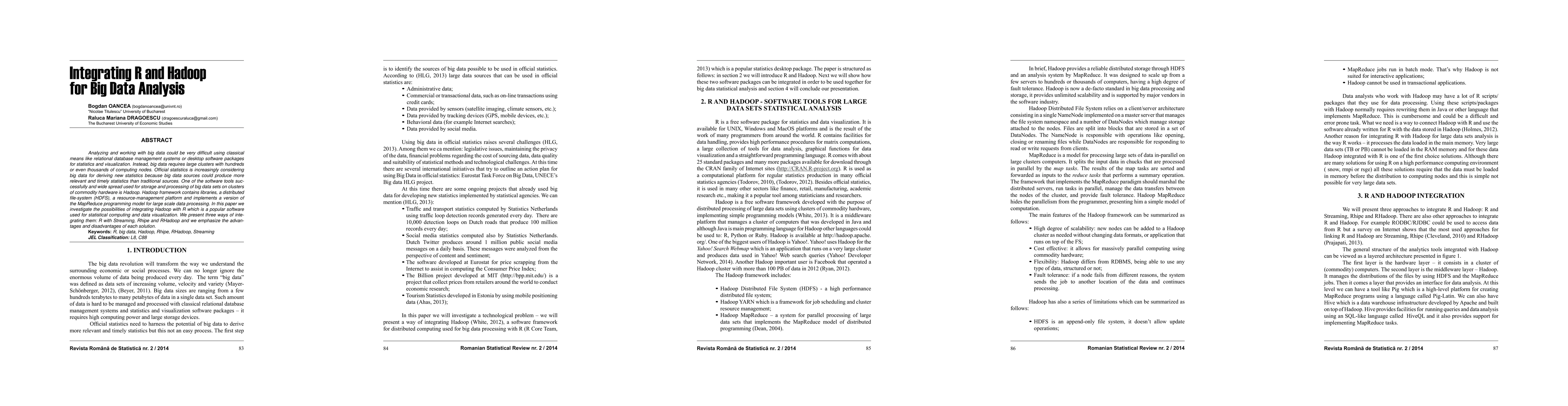 Analyzing and working with big data could be very diffi cult using classical means like relational database management systems or desktop software packages for statistics and visualization. Instead, big data requires large clusters with hundreds or even thousands of computing nodes. Offi cial statistics is increasingly considering big data for deriving new statistics because big data sources could produce more relevant and timely statistics than traditional sources. One of the software tools successfully and wide spread used for storage and processing of big data sets on clusters of commodity hardware is Hadoop. Hadoop framework contains libraries, a distributed fi le-system (HDFS), a resource-management platform and implements a version of the MapReduce programming model for large scale data processing. In this paper we investigate the possibilities of integrating Hadoop with R which is a popular software used for statistical computing and data visualization. We present three ways of integrating them: R with Streaming, Rhipe and RHadoop and we emphasize the advantages and disadvantages of each solution.