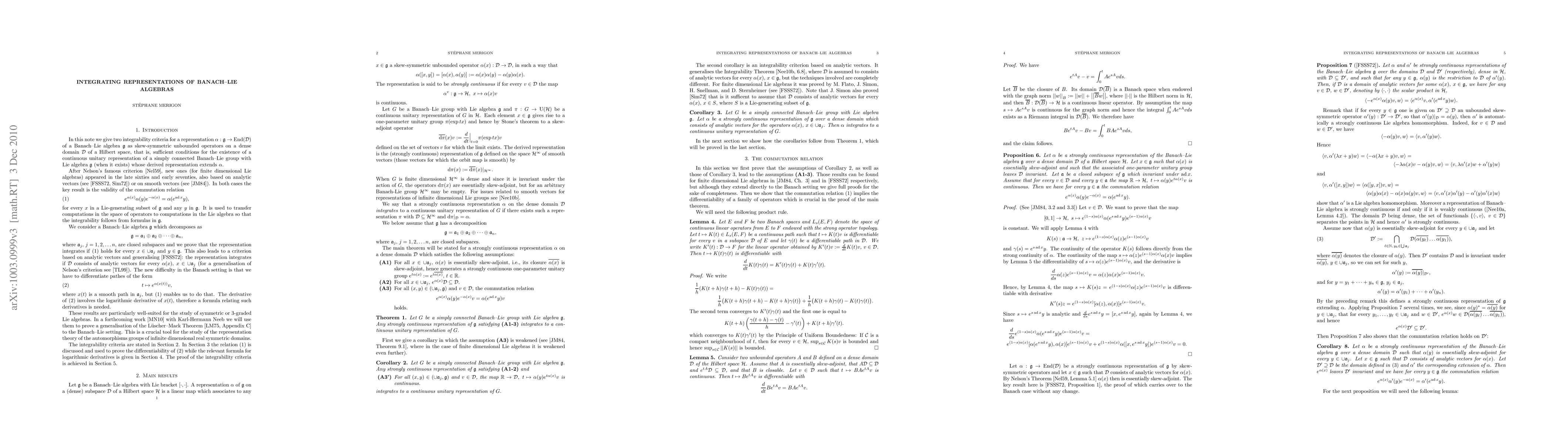 Summary: This paper presents two criteria for the integrability of representations of Banach-Lie algebras as skew-symmetric unbounded operators within a dense domain of a Hilbert space. The study contributes to the understanding of operator theory and functional analysis.