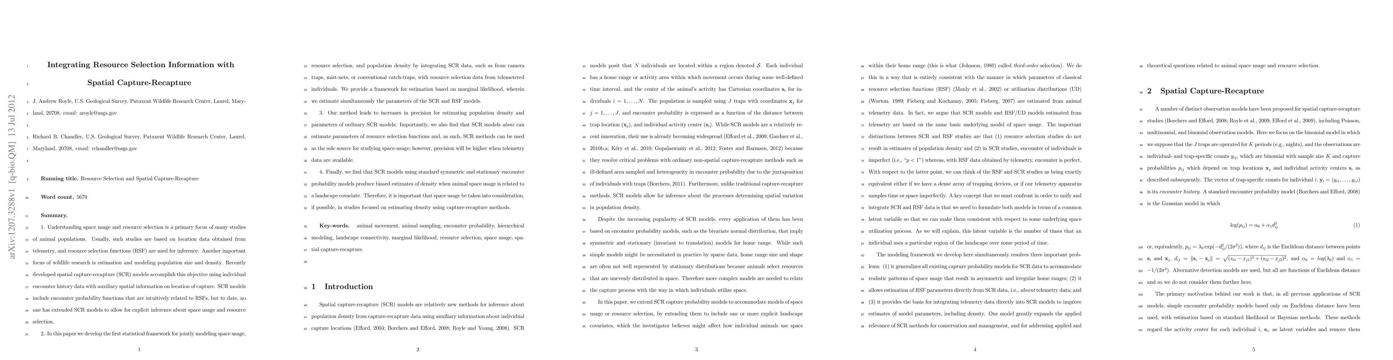 The use of joint likelihoods for SCR/RSF models and the consideration of resources selection in modeling species distribution and abundance are new aspects of this research.