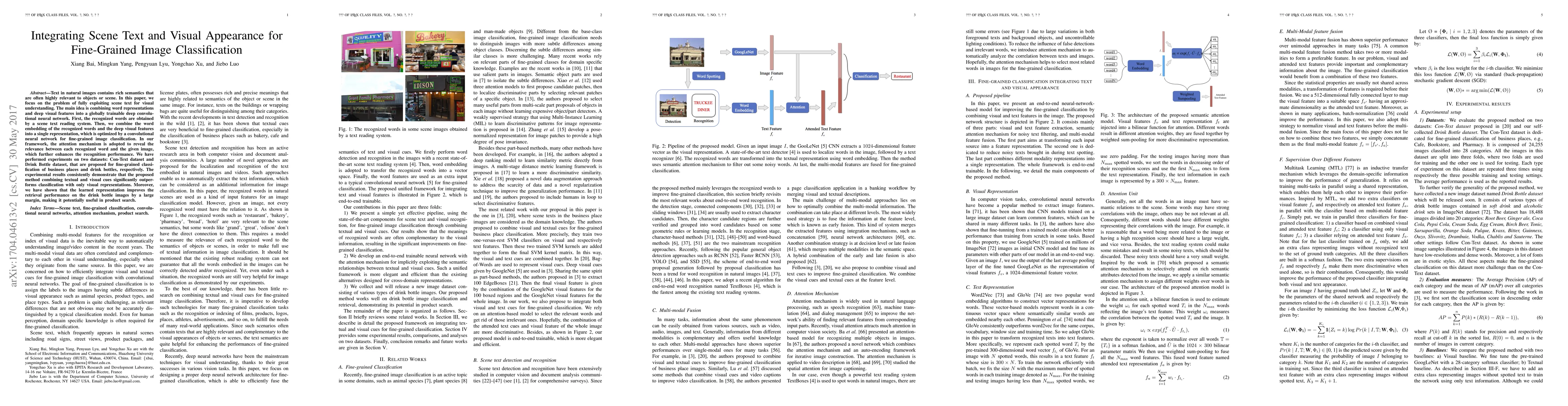 This paper proposes a method to integrate scene text and visual appearance for fine-grained image classification by combining word representations and deep visual features in a trainable neural network. Experimental results show significant improvements over using visual features alone, demonstrating enhanced recognition and retrieval performance.