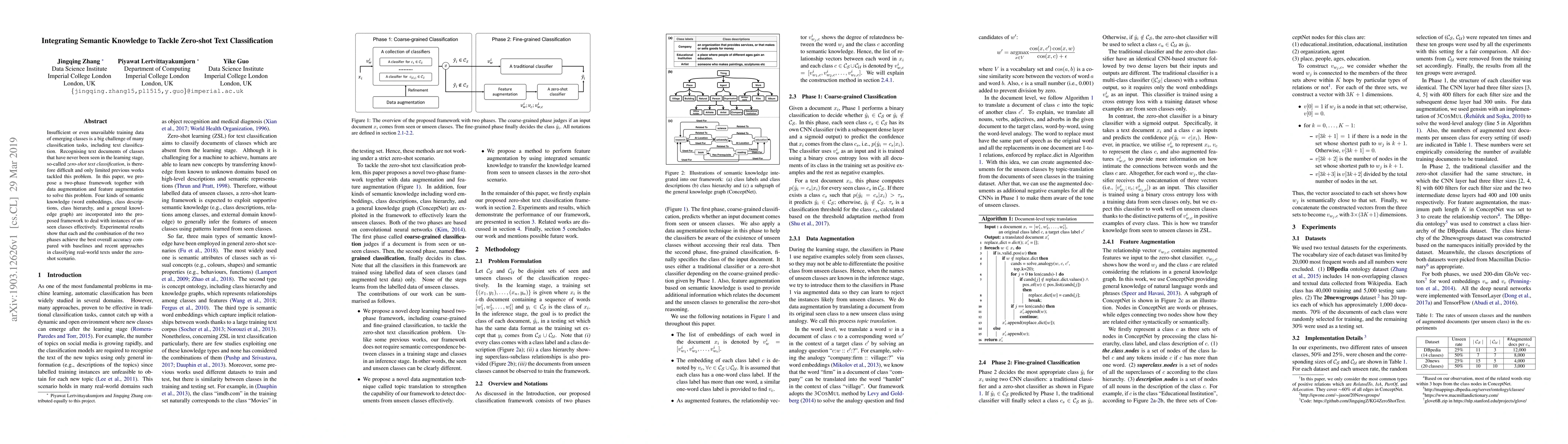 Insufficient or even unavailable training data of emerging classes is a big challenge of many classification tasks, including text classification. Recognising text documents of classes that have never been seen in the learning stage, so-called zero-shot text classification, is therefore difficult and only limited previous works tackled this problem. In this paper, we propose a two-phase framework together with data augmentation and feature augmentation to solve this problem. Four kinds of semantic knowledge (word embeddings, class descriptions, class hierarchy, and a general knowledge graph) are incorporated into the proposed framework to deal with instances of unseen classes effectively. Experimental results show that each and the combination of the two phases achieve the best overall accuracy compared with baselines and recent approaches in classifying real-world texts under the zero-shot scenario.