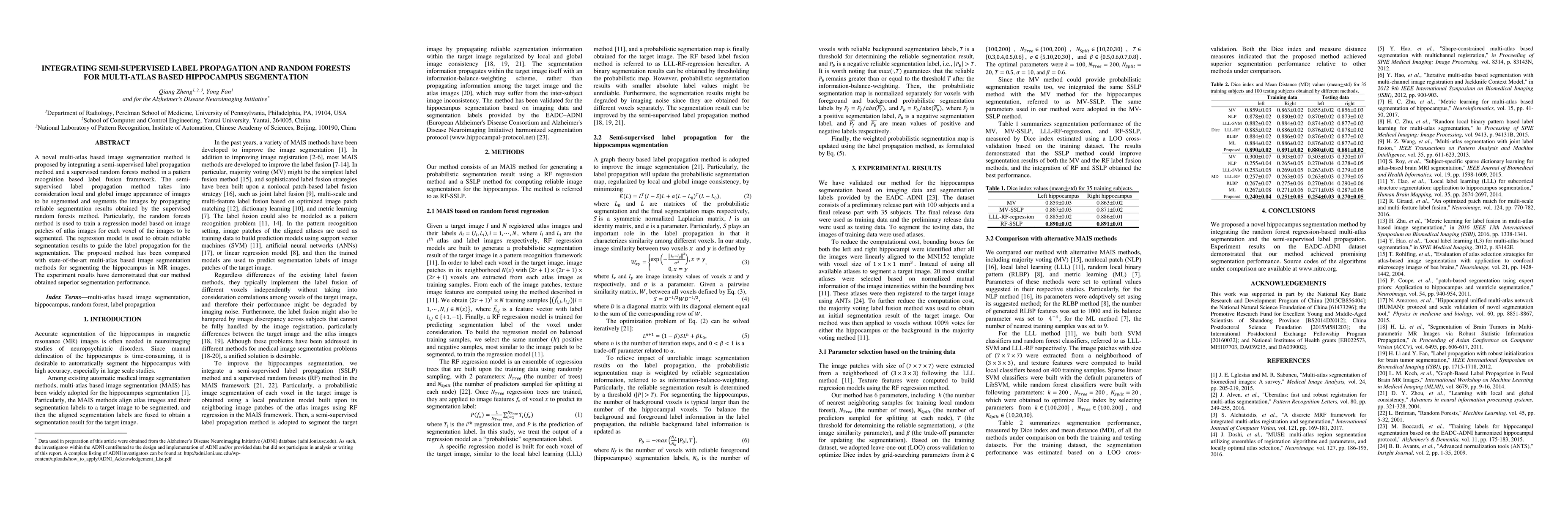 This paper proposes a novel multi-atlas segmentation method integrating semi-supervised label propagation and supervised random forests. The method uses a regression model trained on atlas images to guide label propagation, achieving superior hippocampus segmentation in MR images compared to state-of-the-art methods.