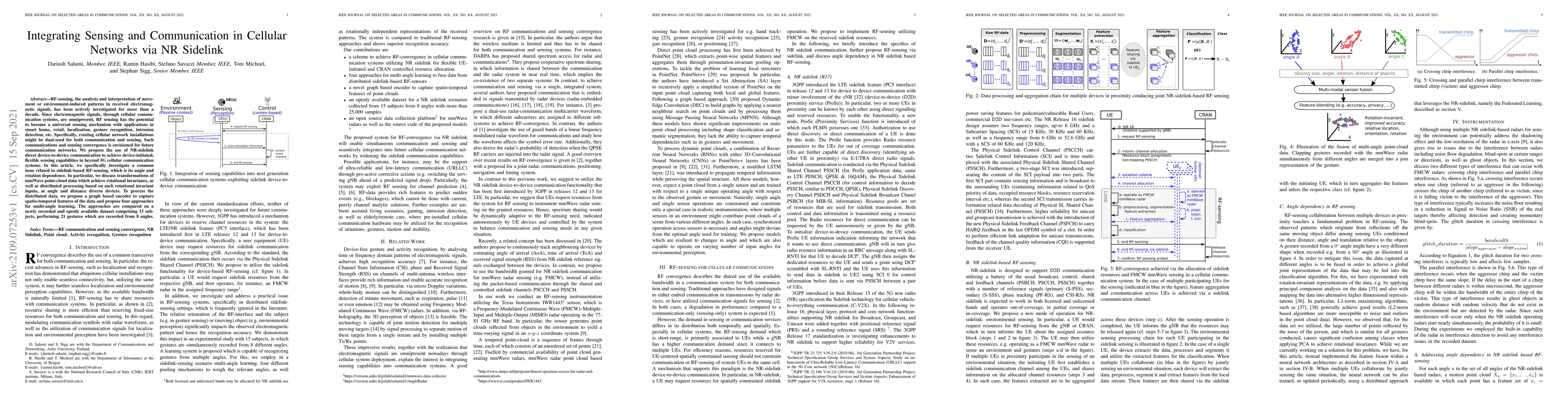 This paper proposes the use of NR-sidelink for integrating RF sensing and communication in cellular networks, focusing on addressing the angle and rotation dependence in sidelink-based RF sensing. It introduces a graph-based encoder for distributed processing and presents four multi-angle learning approaches, evaluated on a dataset of 21 gestures performed by 15 subjects from 8 angles.
