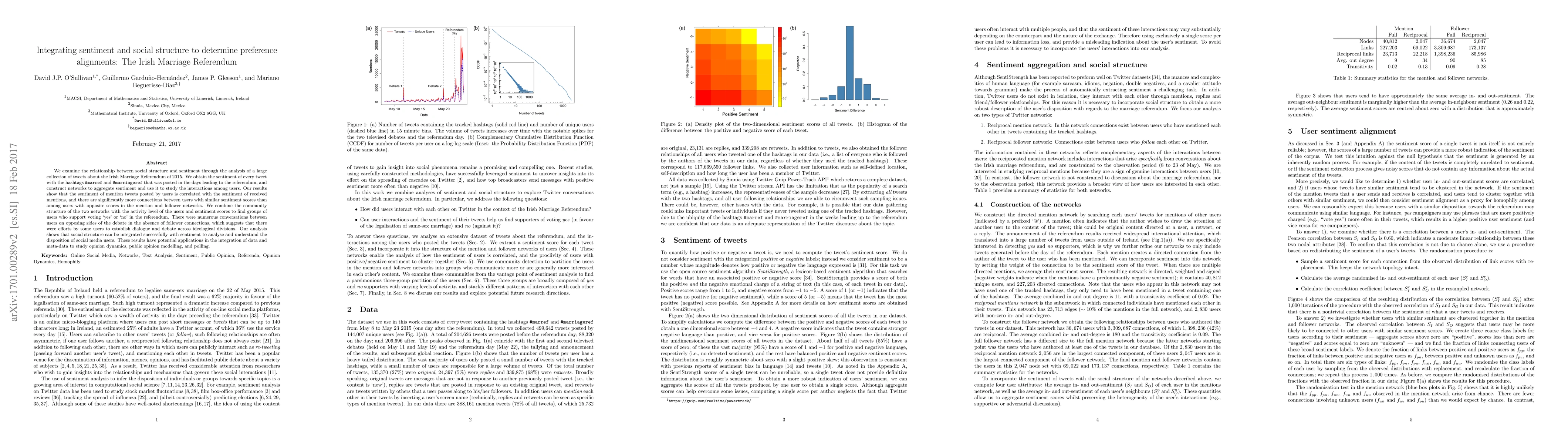 We examine the relationship between social structure and sentiment through the analysis of a large collection of tweets about the Irish Marriage Referendum of 2015. We obtain the sentiment of every tweet with the hashtags #marref and #marriageref that was posted in the days leading to the referendum, and construct networks to aggregate sentiment and use it to study the interactions among users. Our results show that the sentiment of mention tweets posted by users is correlated with the sentiment of received mentions, and there are significantly more connections between users with similar sentiment scores than among users with opposite scores in the mention and follower networks. We combine the community structure of the two networks with the activity level of the users and sentiment scores to find groups of users who support voting `yes' or `no' in the referendum. There were numerous conversations between users on opposing sides of the debate in the absence of follower connections, which suggests that there were efforts by some users to establish dialogue and debate across ideological divisions. Our analysis shows that social structure can be integrated successfully with sentiment to analyse and understand the disposition of social media users. These results have potential applications in the integration of data and meta-data to study opinion dynamics, public opinion modelling, and polling.